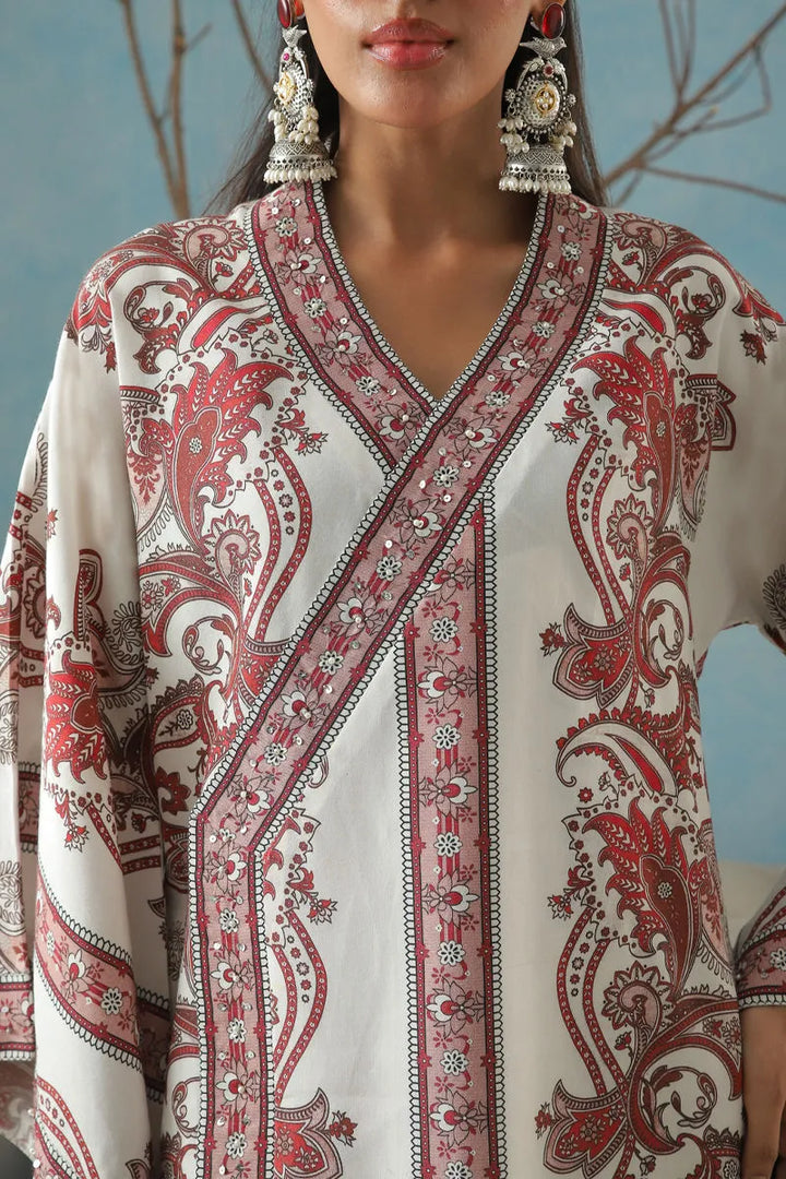 Red-on-white short jacket separates featuring vibrant chintz prints and intricate red detailing, finished with beautifully detailed borders for a striking look.