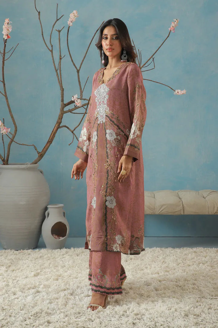 This Shamaeel's exquisite long shirt silhouette showcases luxurious baroque-inspired prints, enriched with intricate golden detailing on silk fabric. The design is further elevated with delicate gold thread outlines and gorgeous resham and zardozi hand embroidery, creating a mesmerizing interplay of texture and shimmer. Stunning embellishments inspired by traditional jewelry motifs add a regal touch to the prints, making this ensemble truly captivating. It is paired gracefully with coordinating printed pants. Matching dupatta can be added seperately, this outfit effortlessly blends classic opulence with contemporary elegance.