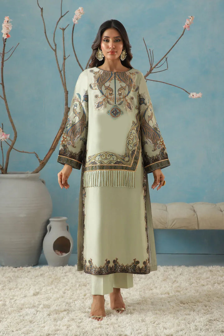 This look is a soft and graceful expression of vintage-inspired eastern luxury, with intricate details and refined color play. A sage green long straight kurta crafted from a silky, flowy fabric. It features a tapestry-style digital print with baroque and paisley motifs in shades of rust, antique gold, and navy. The neckline is modest with an embellished medallion-like centerpiece, while the hem is finished with an elegant fringe detail that adds movement and charm. Full-length sleeves showcase ornate, mirror-symmetrical artwork in warm tones, giving it a regal, almost Kashmiri feel. Borders on the hem and sides of the shirt enhance its classic silhouette. It comes with a coordinated straight pants in matching sage green keep the look minimal and polished.