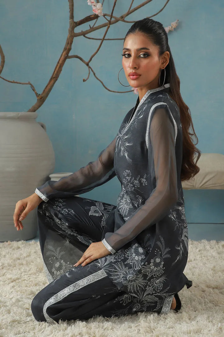 Blue matching separate printed outfit, beautifully detailed with silver lace accents on the borders and neckline.