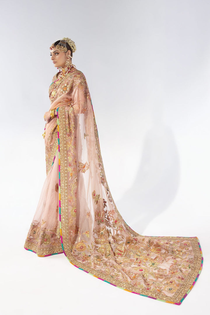 Exquisite elegance awaits. Our jacquard weaved saree blouse shimmers with intricate zardozi embroidery, featuring naqshi, dabka, and multicolored resham threads. Imagine a delicate floral border dancing on your wrists, while a captivating floral landscape graces your bicep. This masterpiece pairs beautifully with a flowing saree and flared petticoat, creating a vision of pure enchantment on your wedding day.