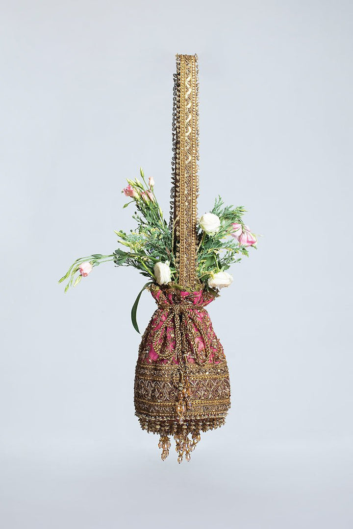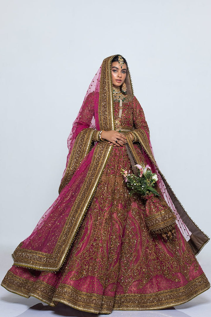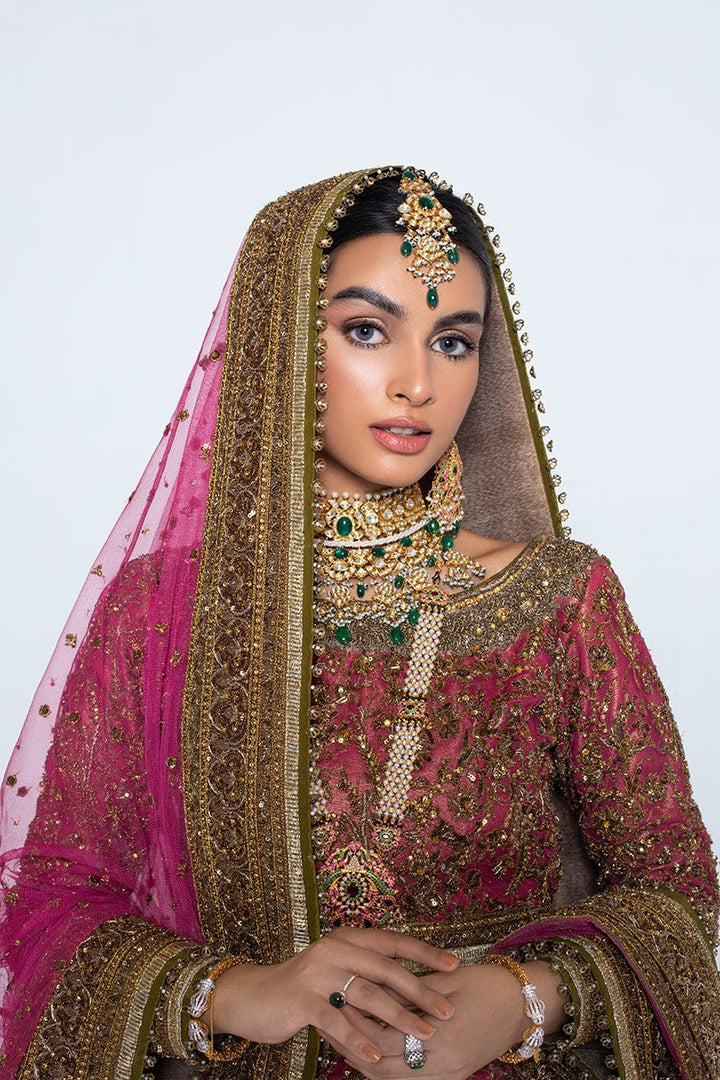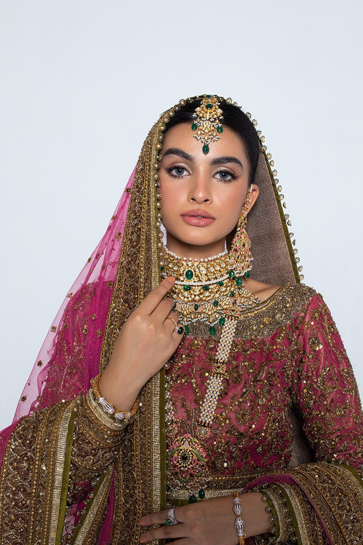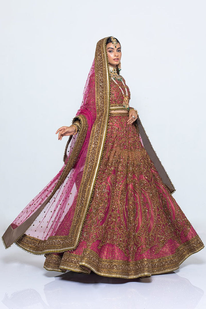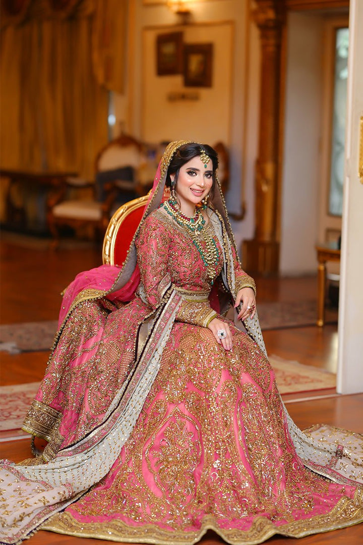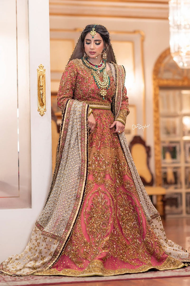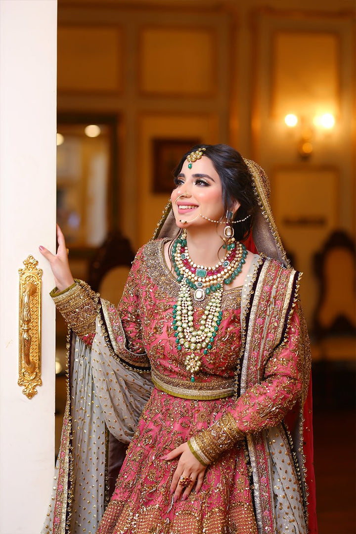 A pink lehenga choli with net dupatta and heavy bordered, finely crafted zardozi design is adorned with industrial embroidery and completed with signature metal finishing.