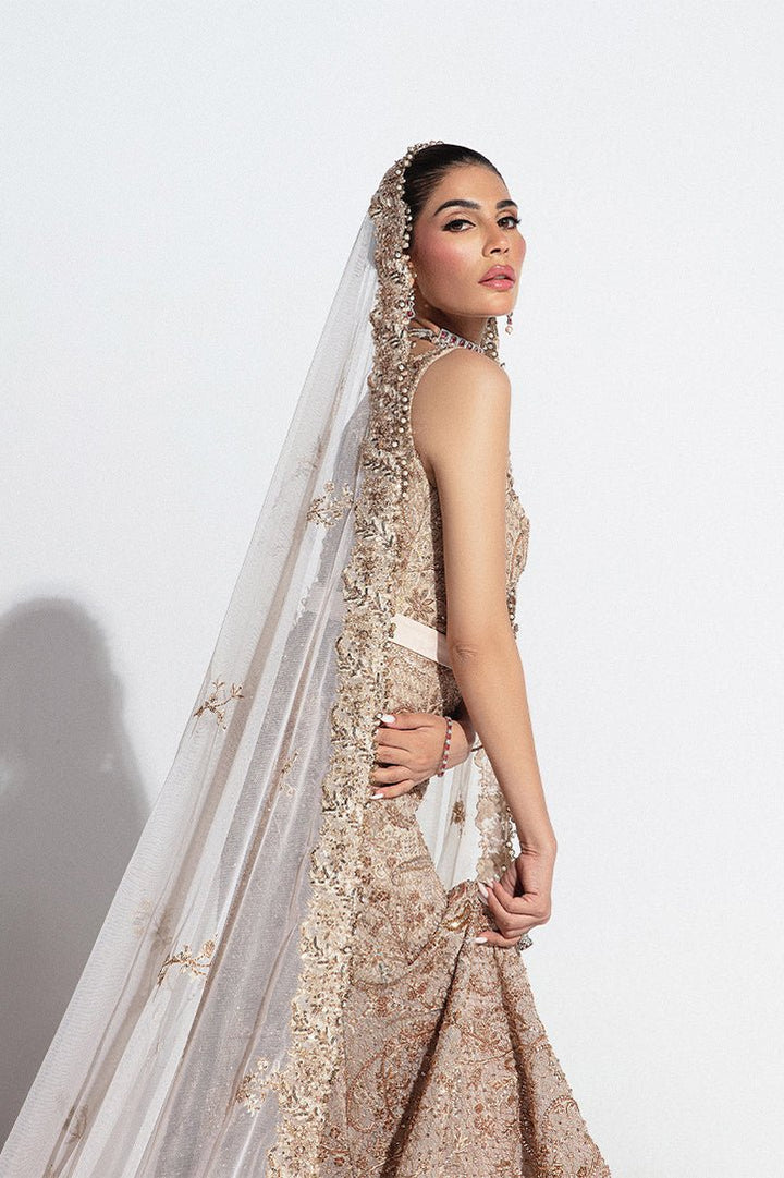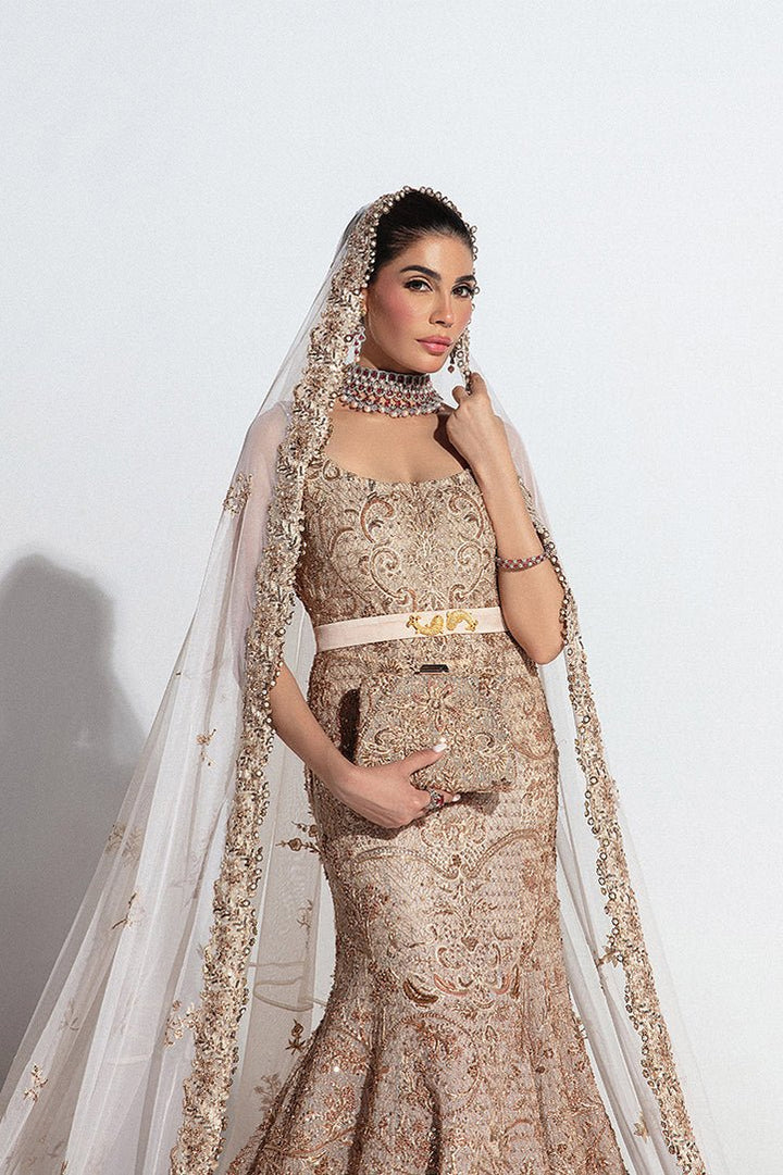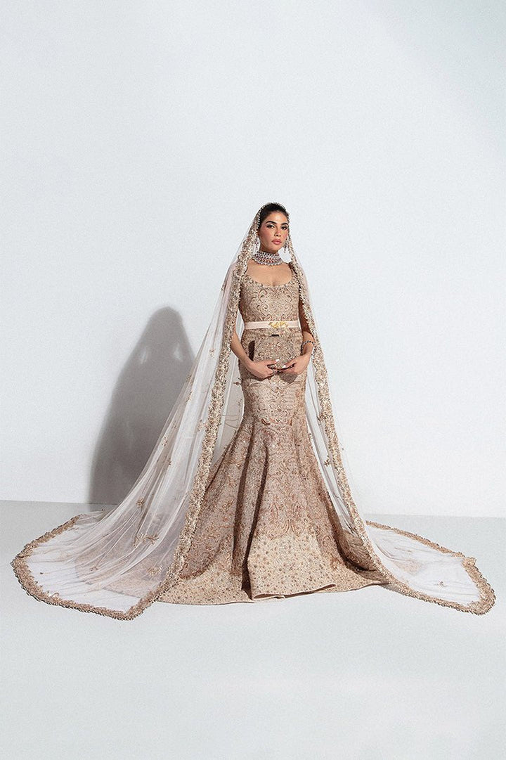 Product Description: Net bridal gown with tail and long veil. Base fabric is of machine embroidery with unique and intricate design joined together. It is fully embellished with ornate hand work which brings this beautiful gown to life. Accessorized with belt.