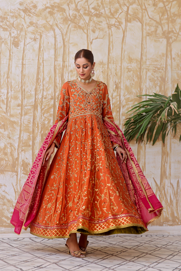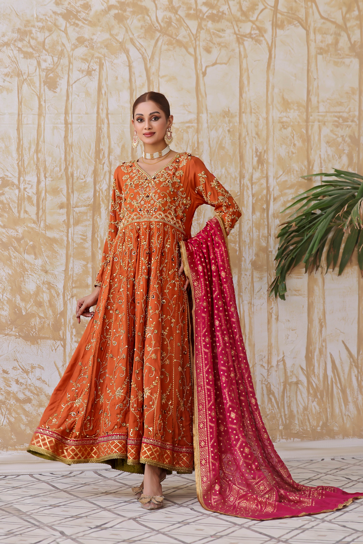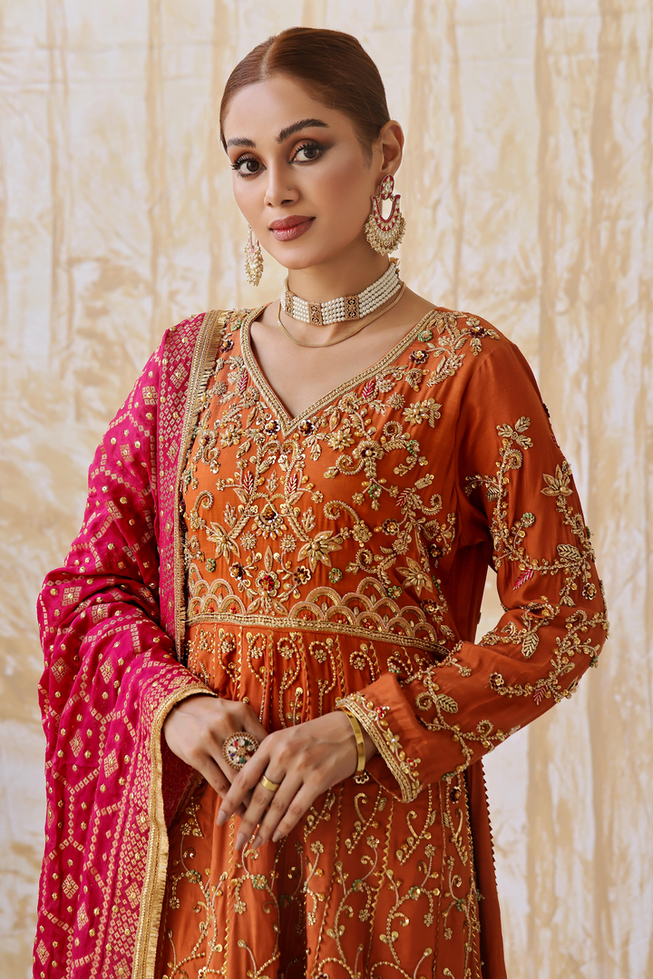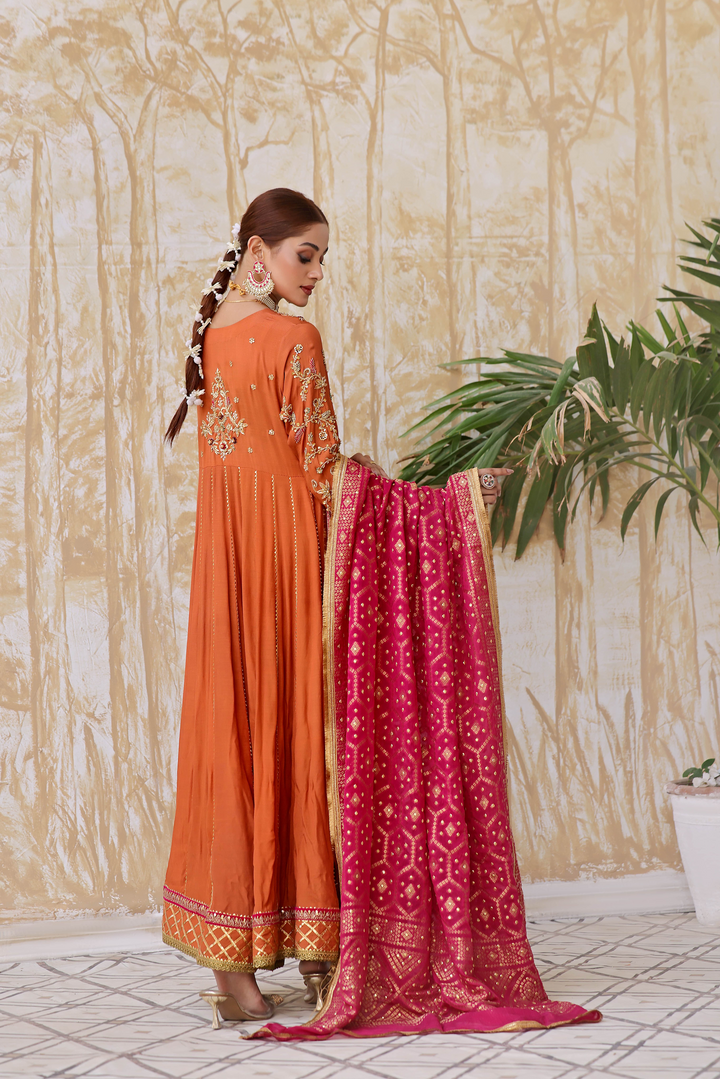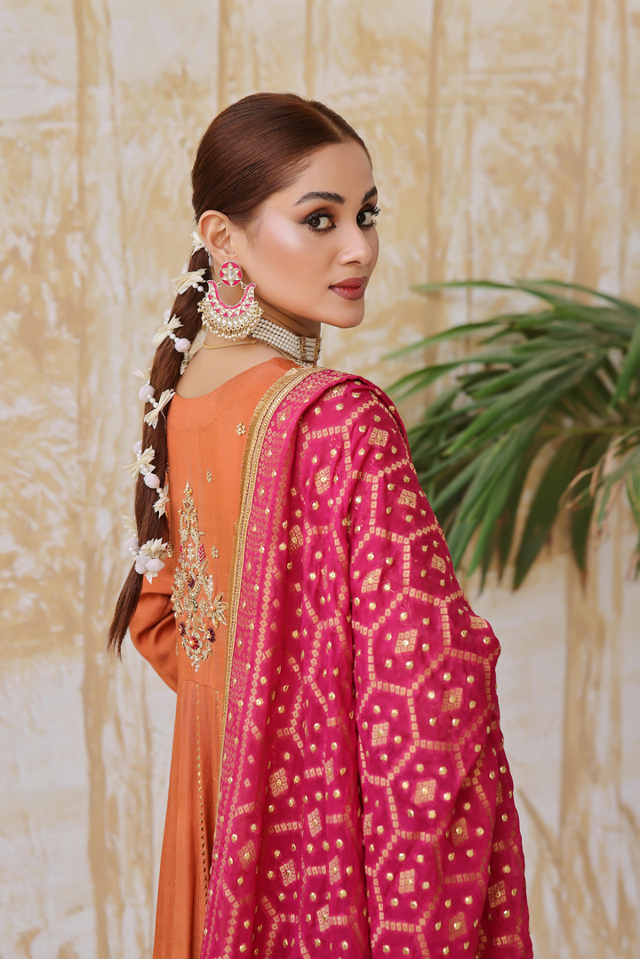 Perfect for ladies who love the elegance of orange, this majestic peshwas is the perfect choice for any wedding celebration. It  is styled with an intricate hand embroidery floral pattern scattered all over bodice and front panels which adds to its timeless charm. To complete the look a motif is given at the back of the bodice. It’s matched perfectly with a gorgeous chiffon hot pink and gold dupatta with heavy chan which boasts a meticulous design with banarsi geometric design.