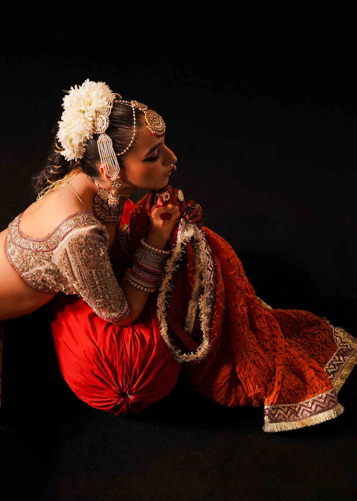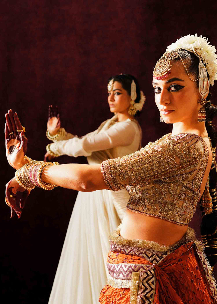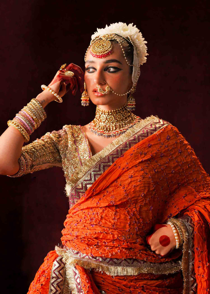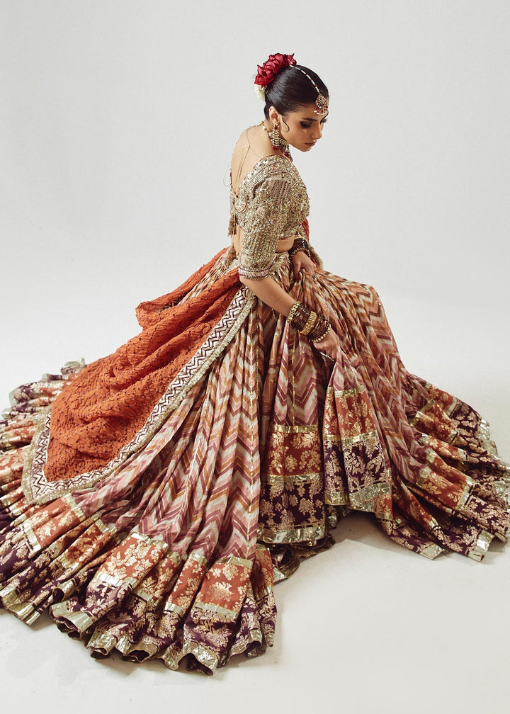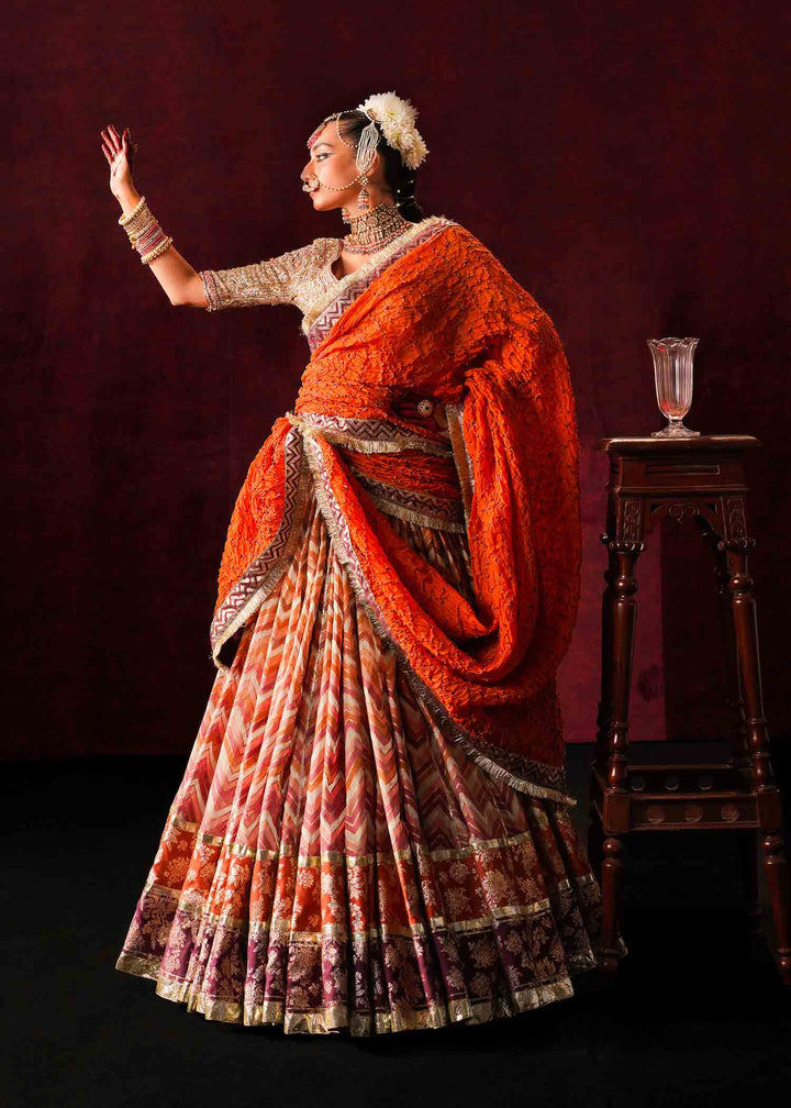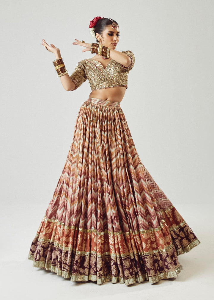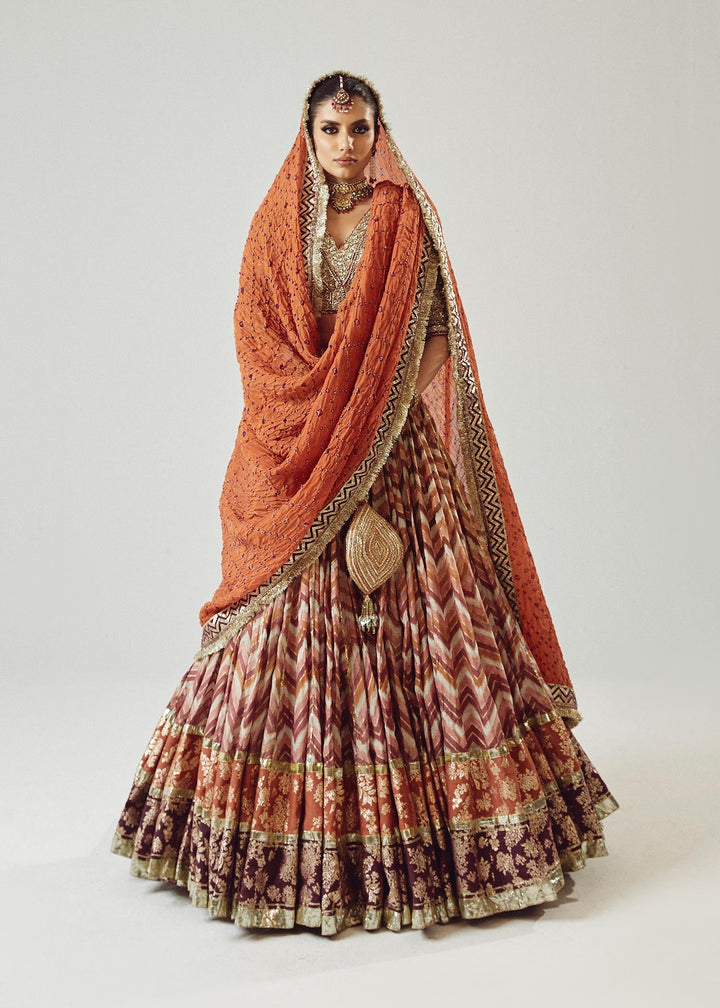 A pure handwoven ivory chanderi silk lehenga, adorned with exquisite block printed chevron patterns. The lehenga is beautifully complemented by rust and purple banarasi borders, adding a touch of regal charm. The choli is a work of art with intricate adda work, and the chunri rust dupatta is finished with stunning purple banarasi borders. This ensemble is a true celebration of tradition and craftsmanship.