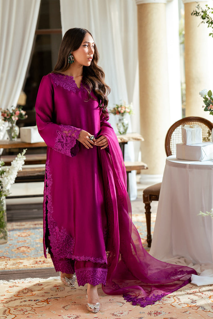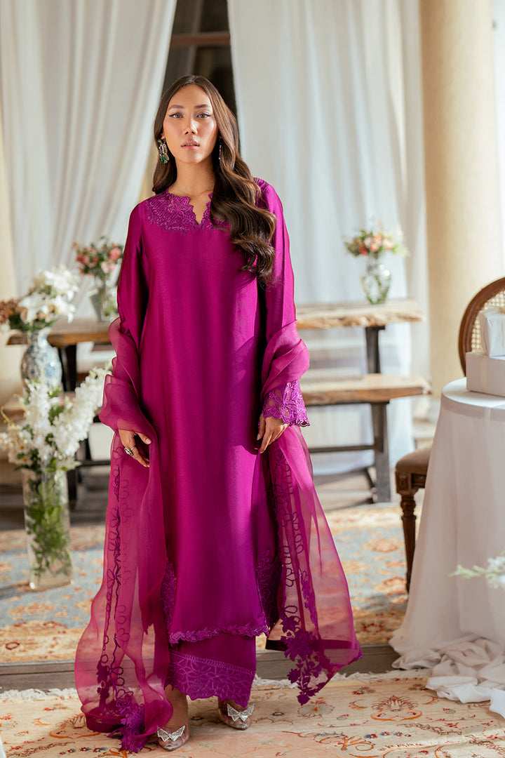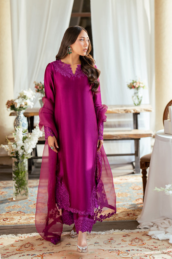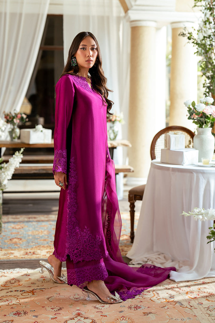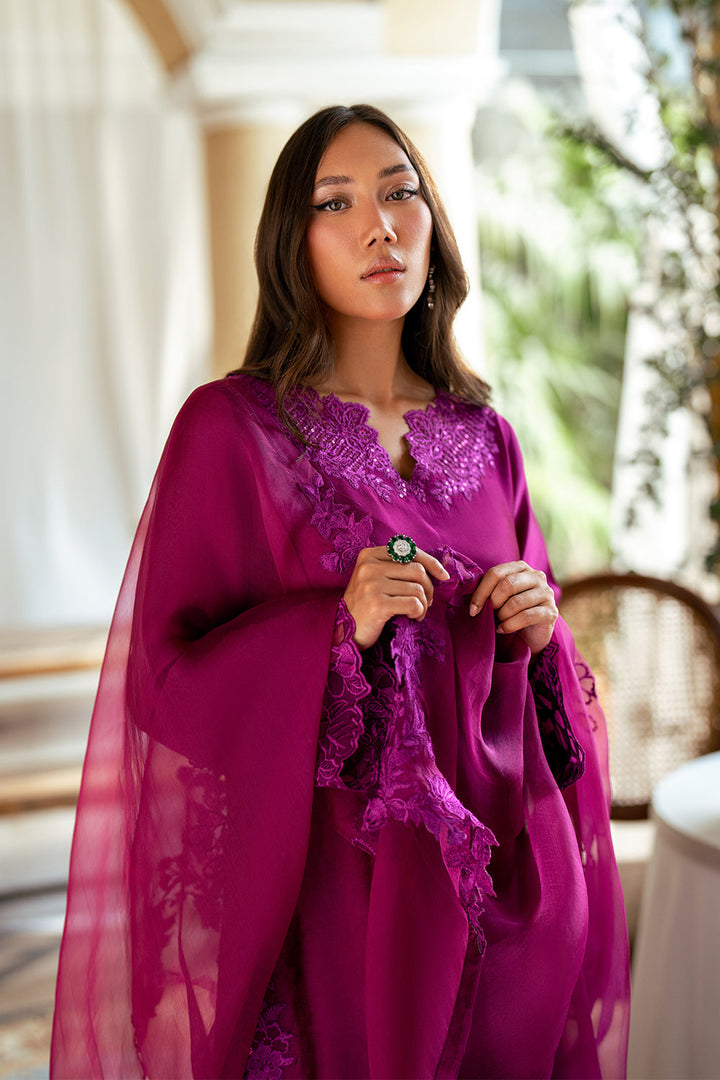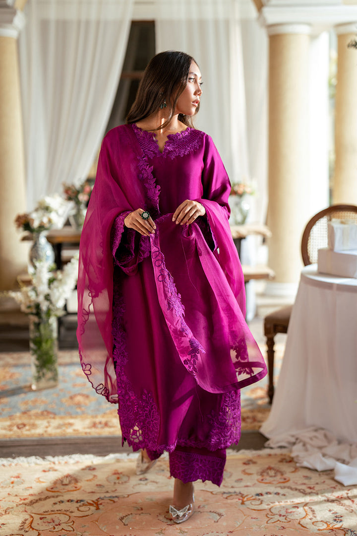 Drenched in vibrant magenta Pure Sheesh silk, majestic plum captivates with its luxurious allure. Paired with elegant culottes and Pure Organza dupatta, this ensemble strikes the perfect balance between modern edge and timeless grace.,