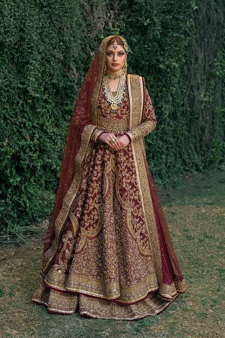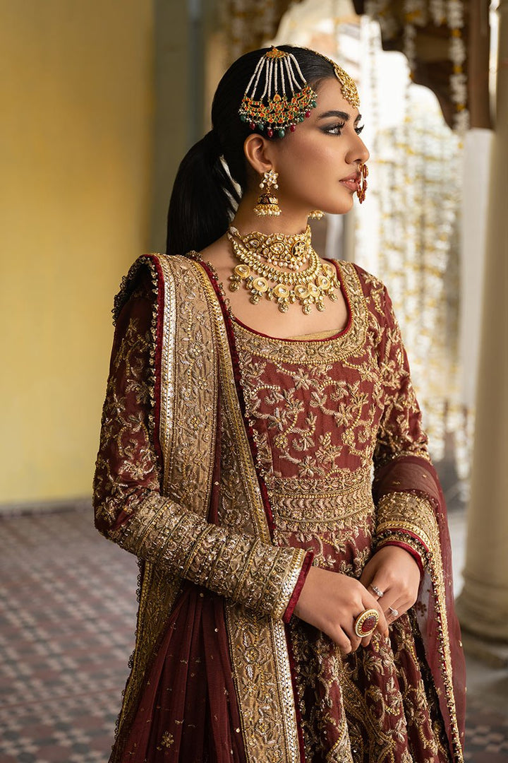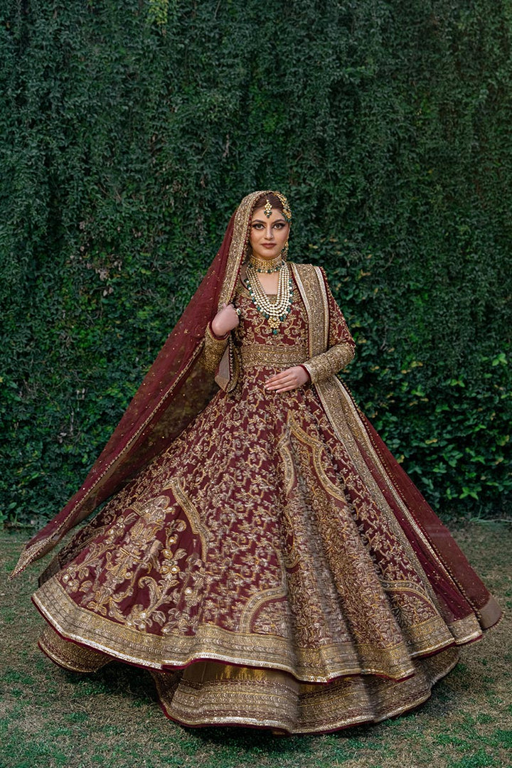 Maroon anarkali on organza embellished with adda work all over the dress paired with antique tissue lehnga with border on it finished with velvet.Net dupatta with four side adda work border,sitara spray on dupatta finished with gotta,velvet and tim tim.