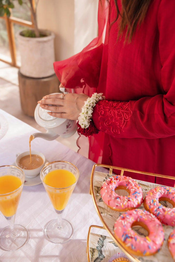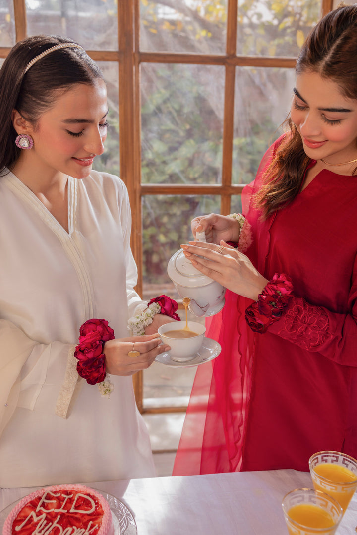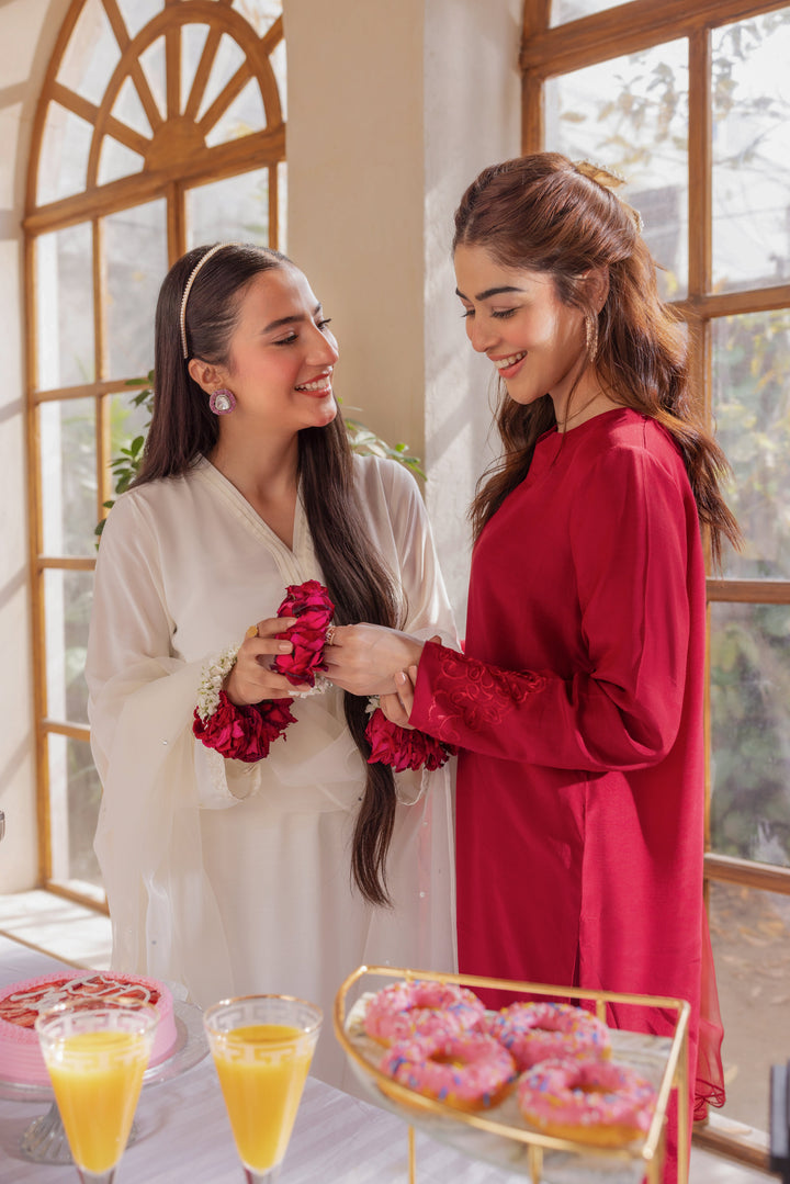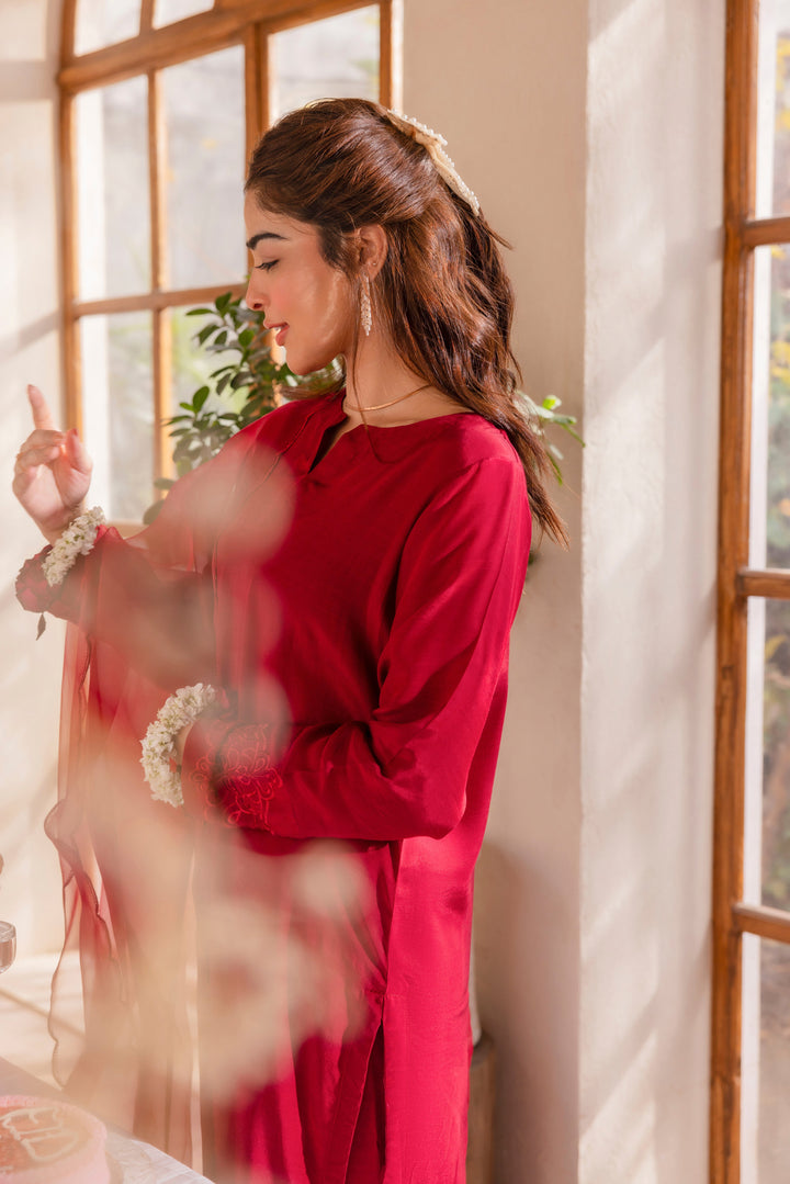 This stunning maroon outfit features an elegant long shirt, beautifully made with a v-cut neckline. The intricate motifs on cuffs are crafted with maroon resham thread. It’s paired with a trouser and an organza dupatta with a scalloped border on all four sides.