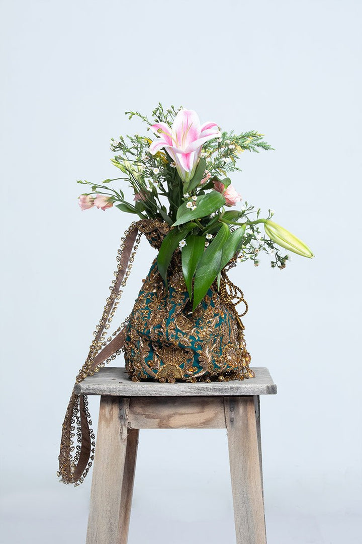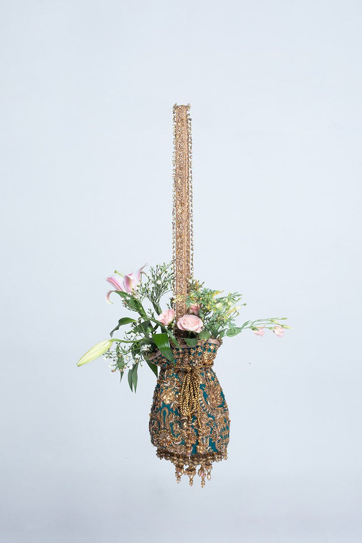 A unique jade green traditional front open Anarkali paired with a lehenga. The surface is adorned with 3D flowers and delicate handmade zardozi details, fringed and decorated hem and belts, refined with antique tissue. Finished with signature metal finishes on Dupatta and Shawl