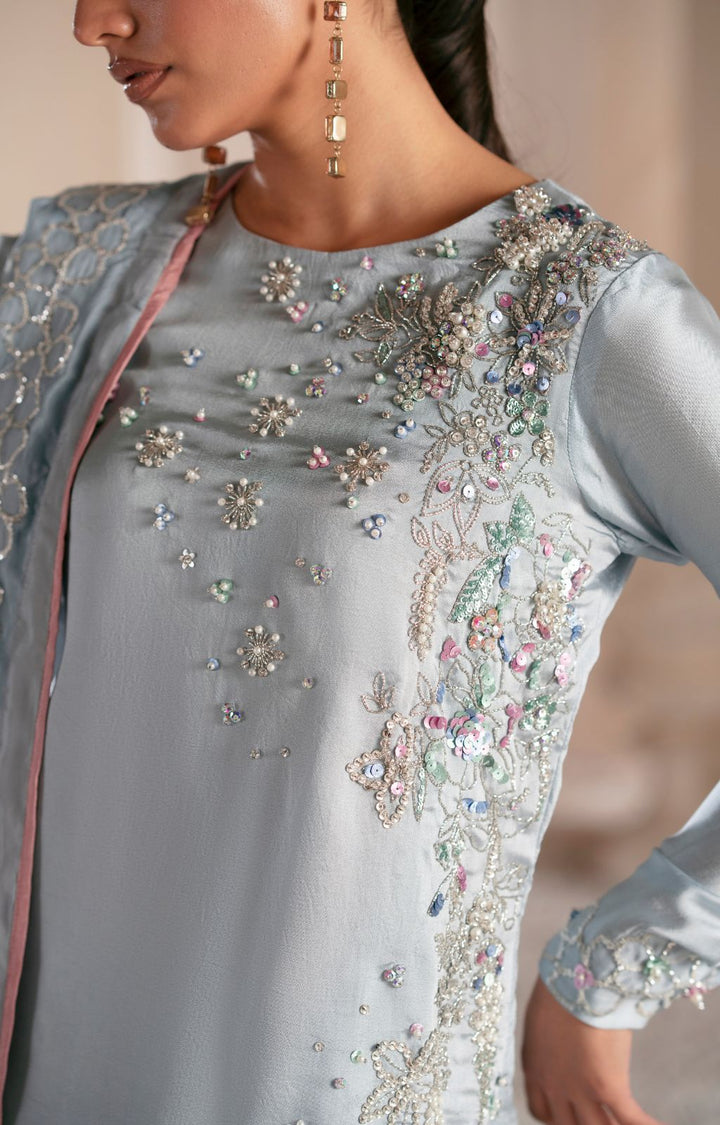 Luxurious Sheesha Silk ✨ Immerse yourself in the artistry of this silver grey hand-embellished shalwar suit. Swarovski, sequences & chtdanas create captivating shimmer. Modern cut meets timeless elegance. Paired with a tea pink silk dupatta featuring a sequined border and tea pink finishing. Signature embellishments. A masterpiece of design.