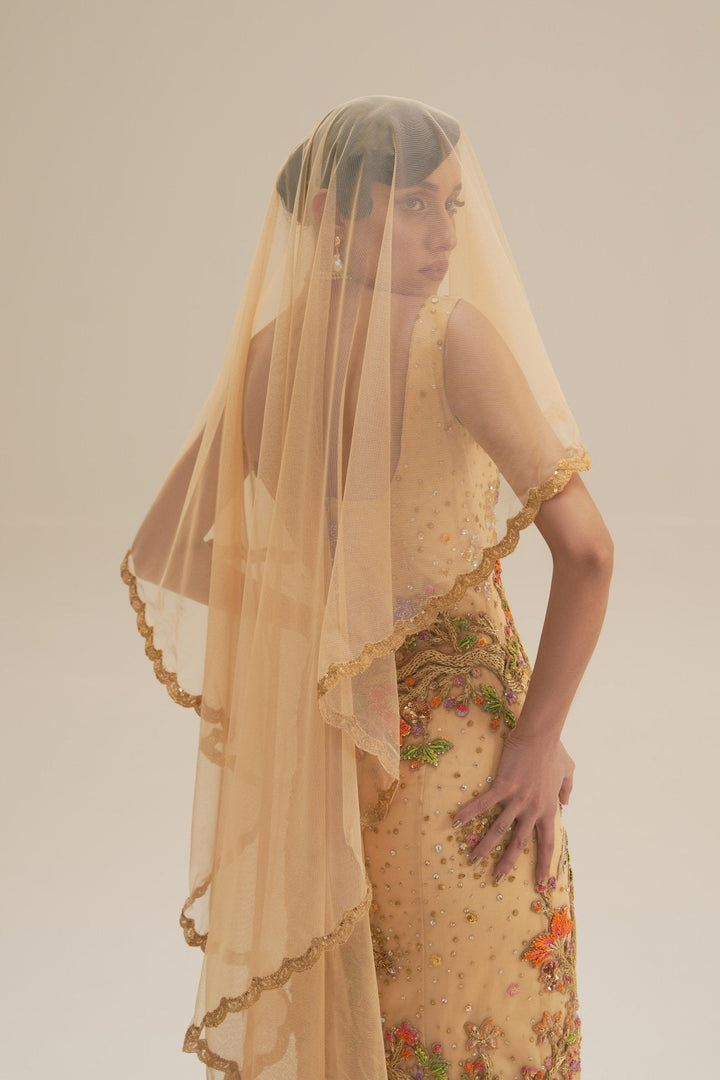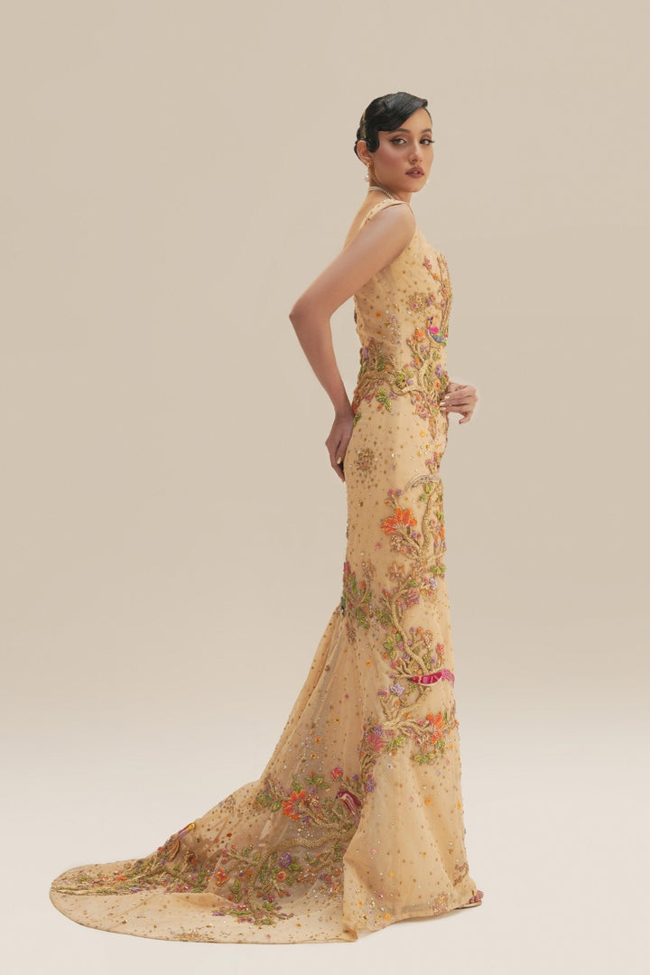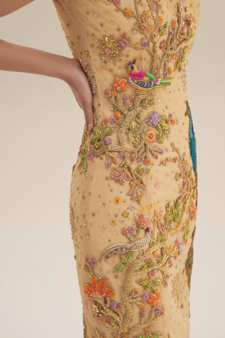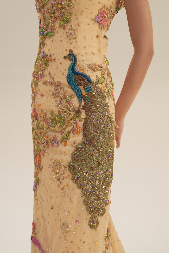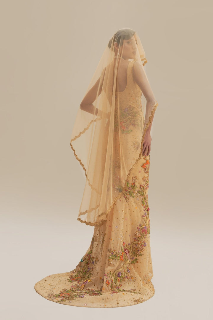 An exquisite fitted, floor length gown featuring intricate embellishments.In a soft golden-champagne hue, it is adorned with detailed embroidery, beadwork, and delicate threadwork. The floral and vine motifs, intertwined with a majestic peacock design and graceful birds, add a regal and artistic touch. The square neckline and delicate shoulder straps enhance its elegant silhouette, while the shimmering sequins and intricate knot detailing create a luminous, opulent effect. Flowing into a breathtaking back train, the gown exudes a sense of grandeur and movement. With its enchanting details, this masterpiece evokes the magic of a whimsical wonderland garden, where nature and couture artistry intertwine in perfect harmony. The ensemble is perfected by a stunning cathedral-length veil, featuring intricate embroidery and luminous accents that beautifully unite heritage and grande