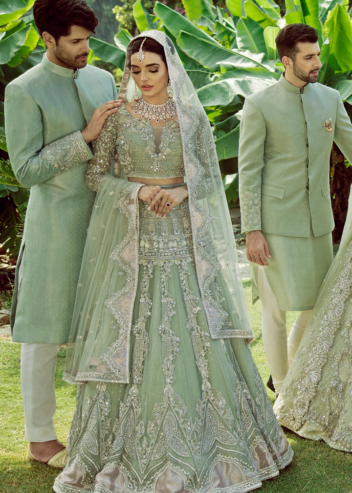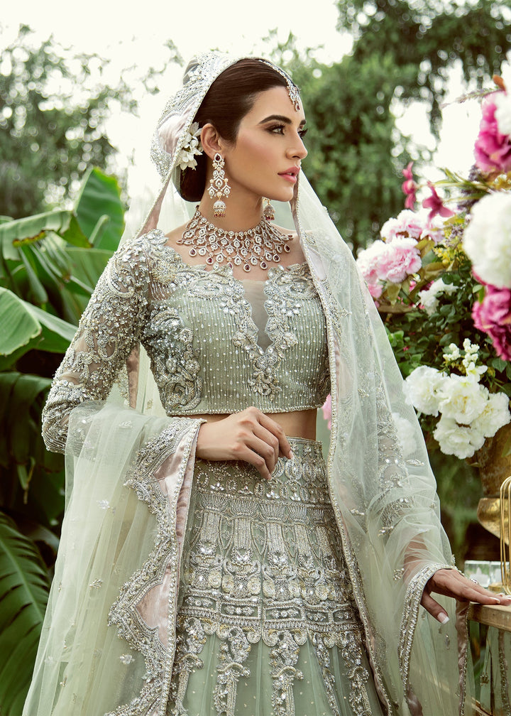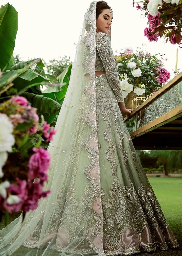 A gorgeous shade of mint offset by a hint of pastel pink. The design features delicate pillars wrapped in floral vines running down the skirt and finished off with a thick border.