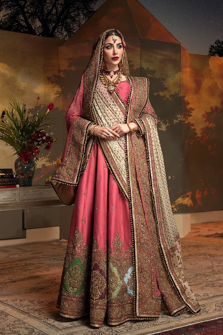 A traditional, heavily embellished katha bridal comprising of a lehenga,