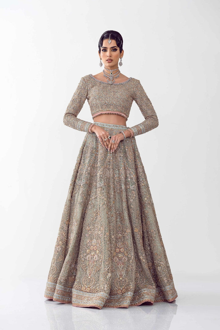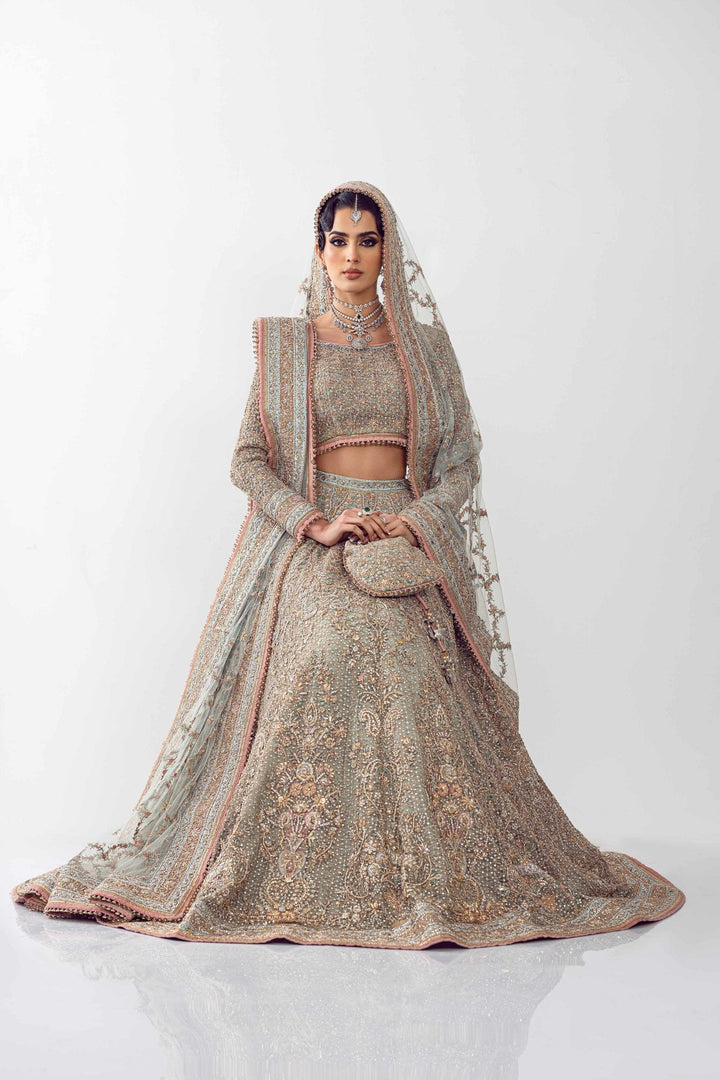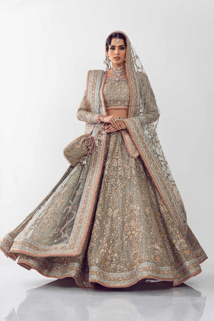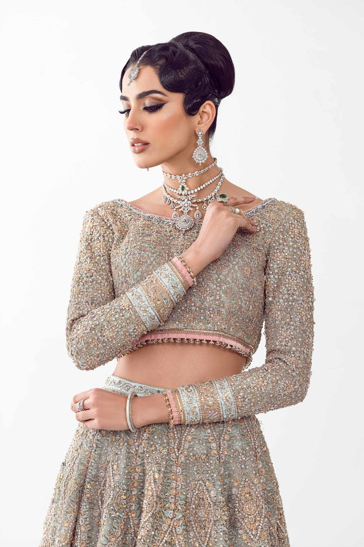 Ice blue Base net Lehnga with powder pink and yellow embroidery and silver zardozi and jewel work paired with net choli with powder pink and yellow industrial embroidery with silver zardozi and jewel work on neck-line and all over and net base dupatta geometrical jall inside and all over border.