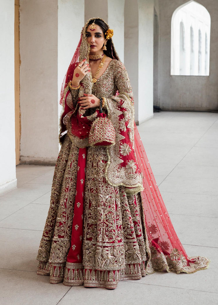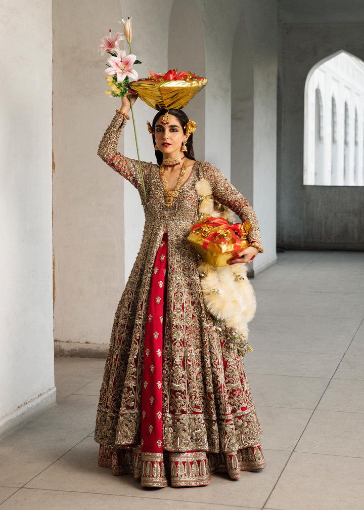 A dazzling showstopper scarlet colored floor length net peshwas with front open detail, finished with stunning gold adda work of naqshi, dabka, sequins and buggle beads. It comes with flared satin silk lehenga with luxuriant border of adda work details in gold and chatta of small Botis throughout. It comes with a net dupatta of 4 yards with wide border on all sides, intricately gold adda work of naqshi, dabka, sequins and muqash and chatta of aureate sequins and borders are finished with gold Kiran.