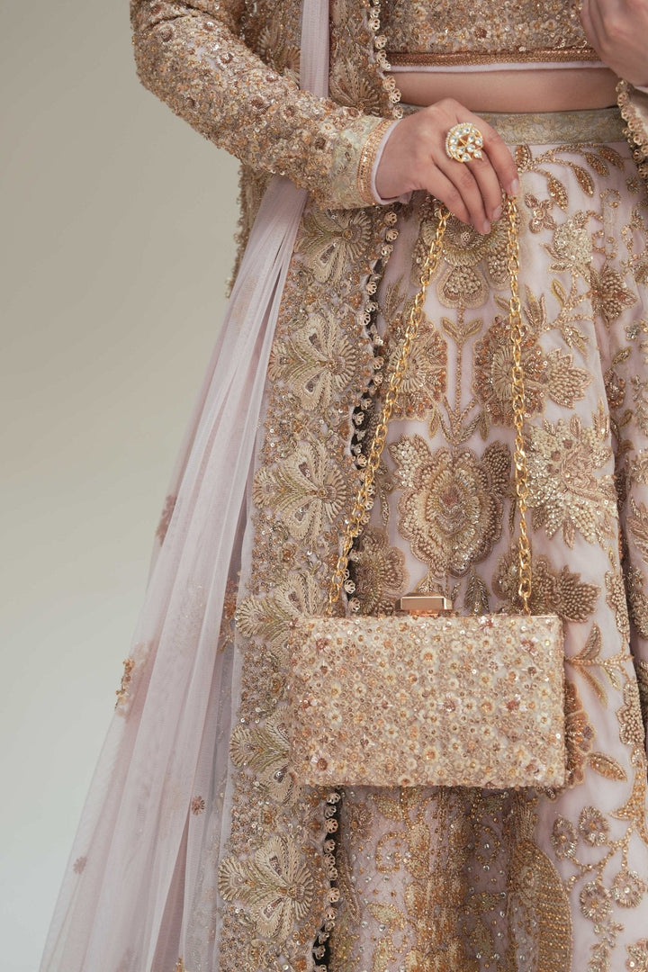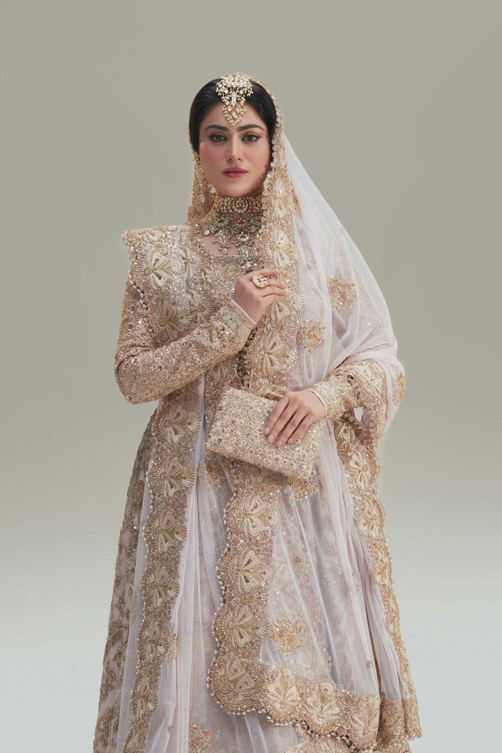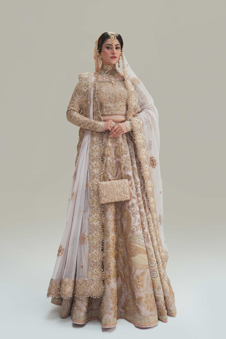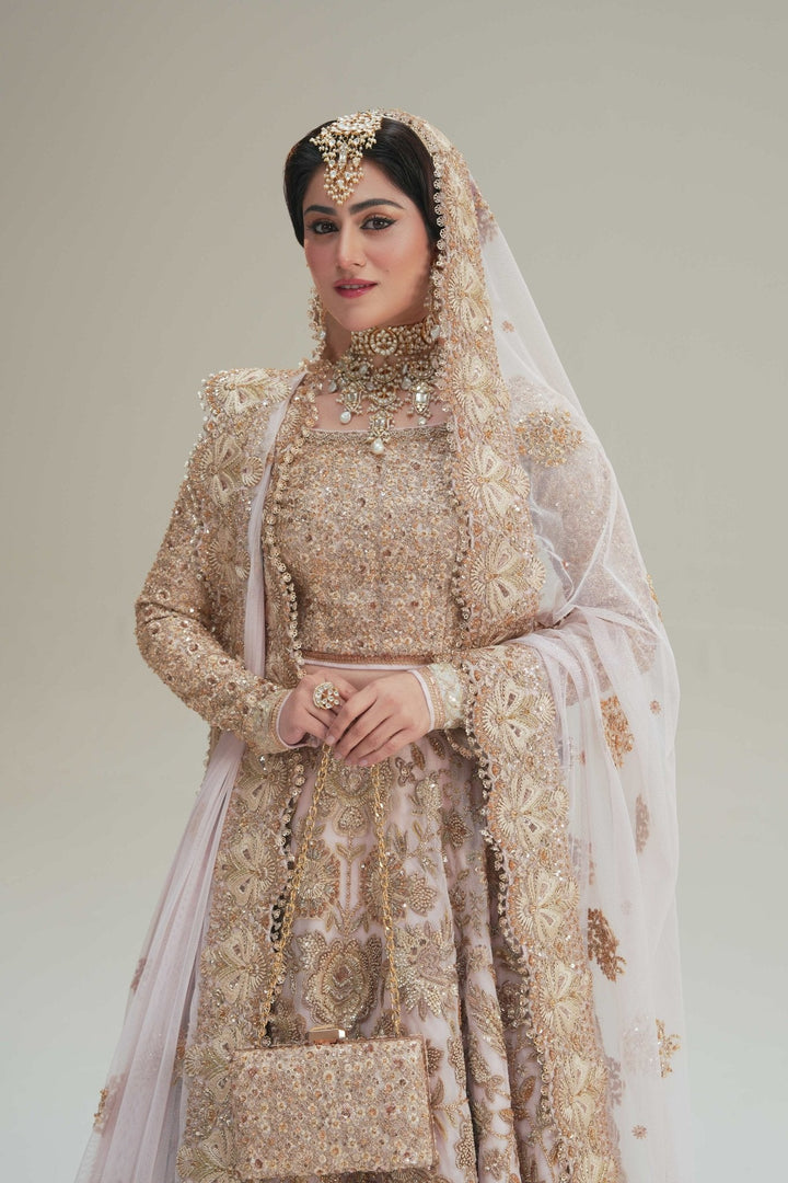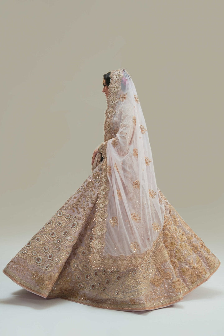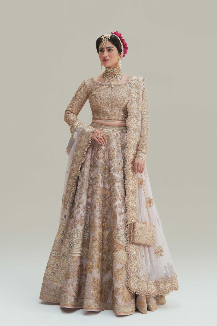A poetic blend of grace and tradition, Mormahal enchants with its exquisite pink net lehenga choli, featuring a structured corset adorned with intricate embroidery and delicate handwork embellishments. Paired with an ethereal net dupatta with a beautifully adorned border, this ensemble radiates regal sophistication