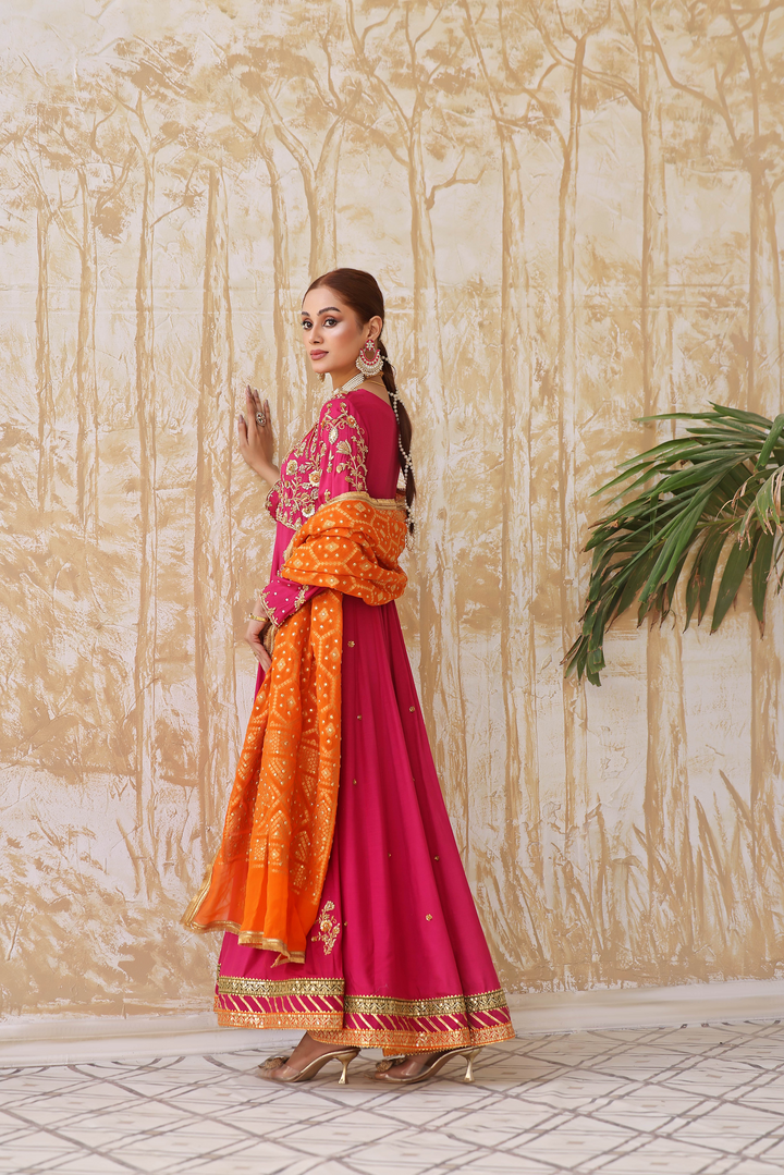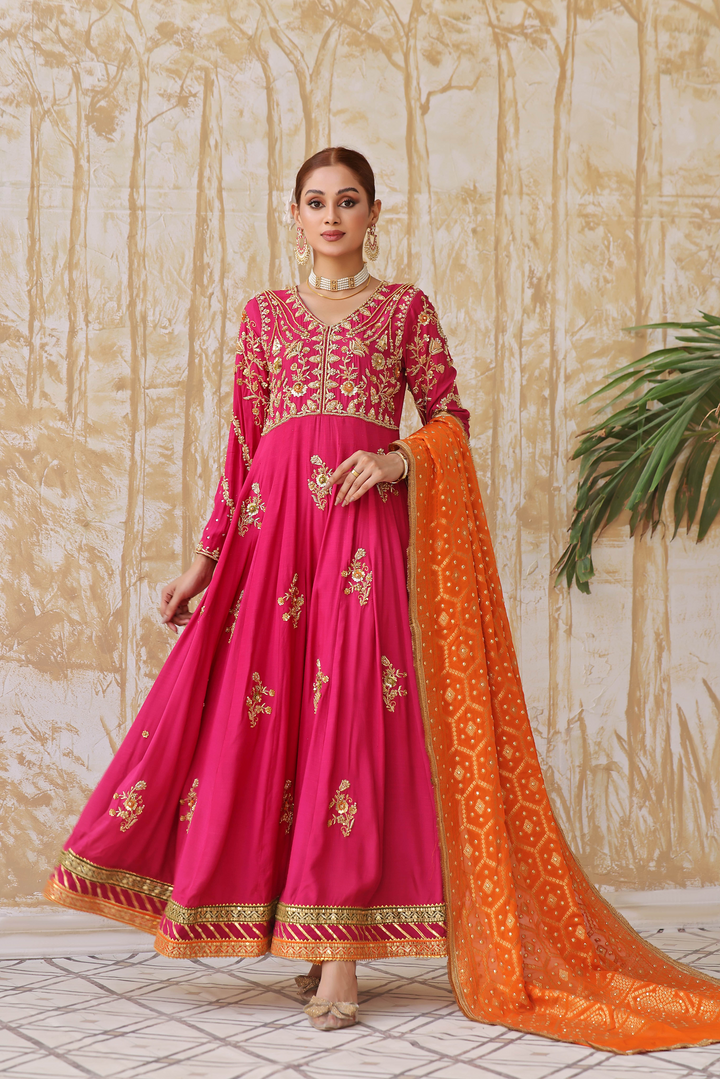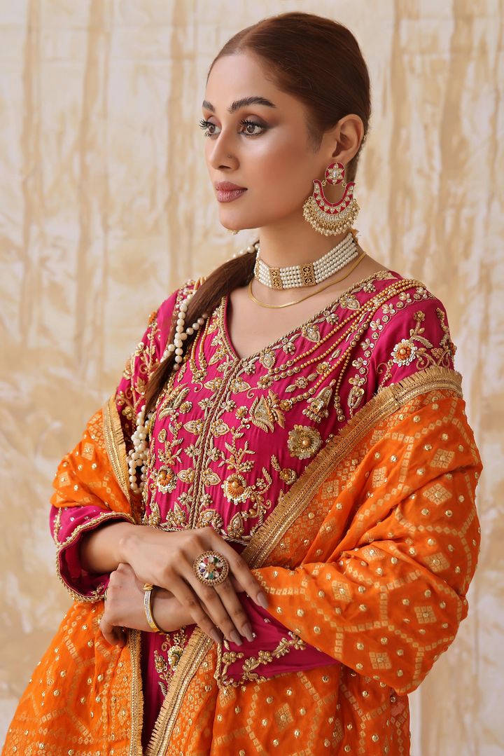 This maxi is made for luxury and grace! and you feel no less than magical wearing it. The bodice is filled with handmade embroidery with a bespoke neckline that adds volumes to its charms. The panels are embellished with handmade motifs which are spread all over the front panels. Adorned with customized detailing at the daman and paired with a contrasting chiffon dupatta with heavy chan  , it is a great option for any occasion.