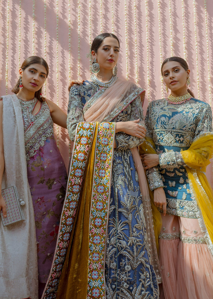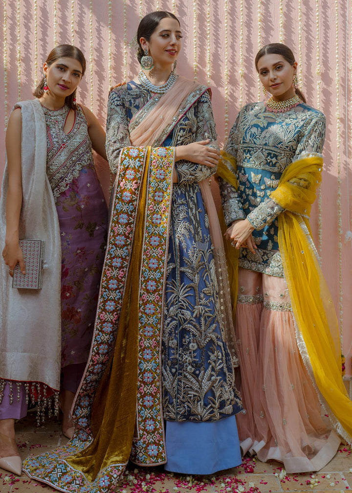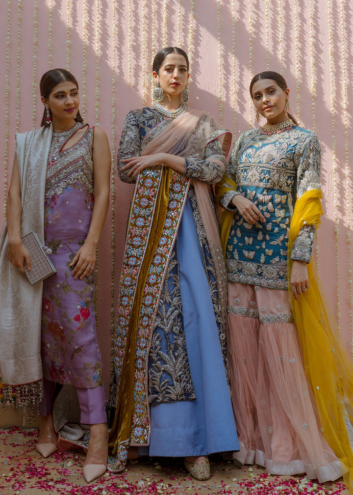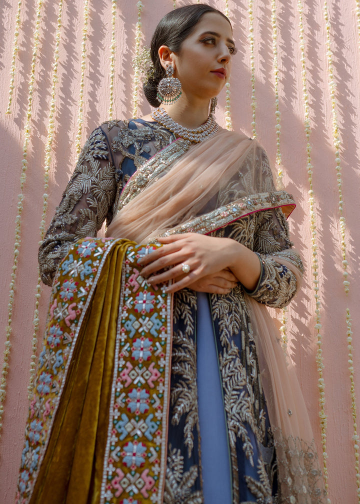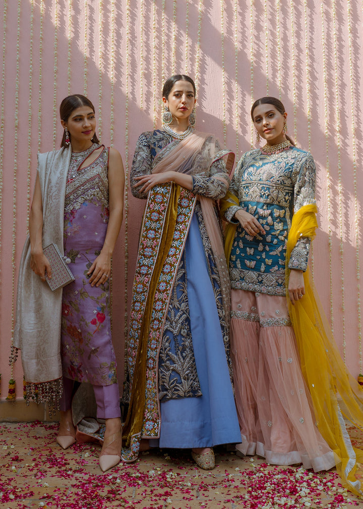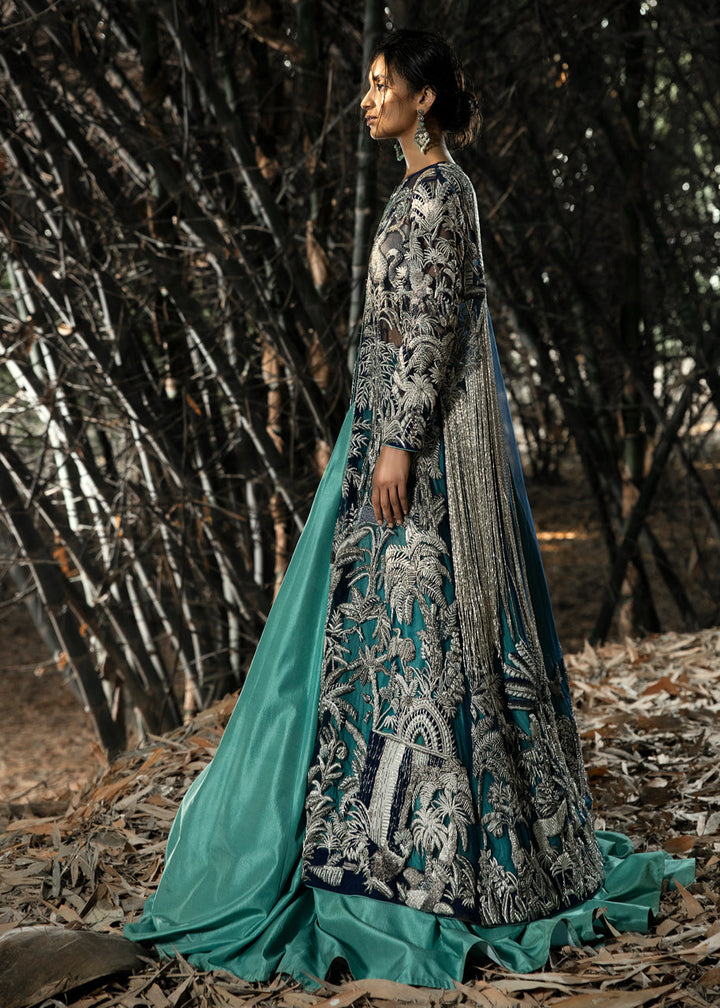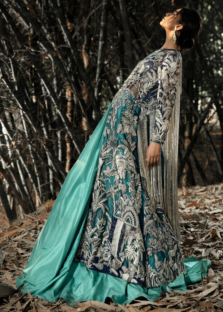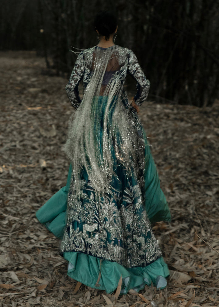 This garment is divided into two parts, a gown and a floor length skirt. The front open blue net gown is floor length with full sleeves. The gown has thick jungle inspired silver embellishments on the front, the sleeves and on the hem. Long tassels fall almost to knee length from the shoulders and neckline on the back side of the gown. A medium silk slip accompanies the gown. The skirt is made in dyed blue raw silk, kept plain and lined with medium silk. The garment is finished with blue piping.