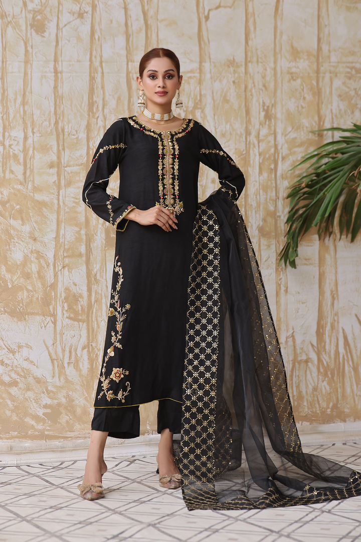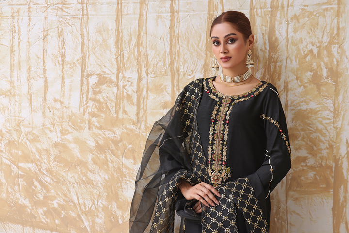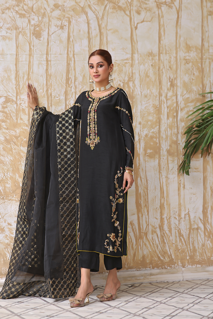A radiant display of elegance, Nightingale is cut from Korean rawsilk in a long straight pattern. The neckline is embroidered in dhanni & red colors combined with kora ,dapka & resham work with long motifs on the front daman to complete its wondrous look. It is paired with a matching organza dupatta with four side border.