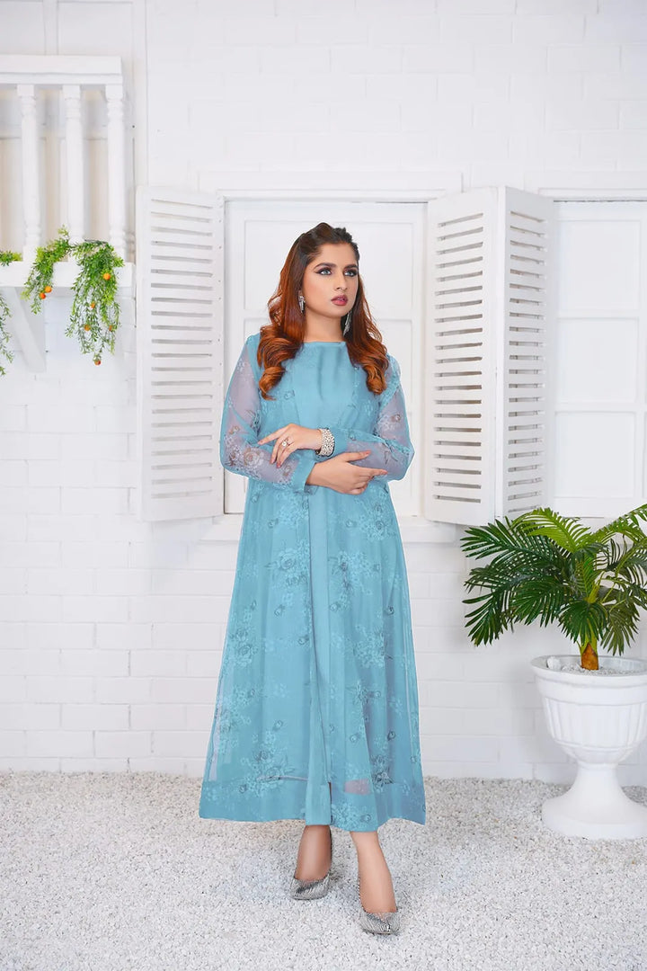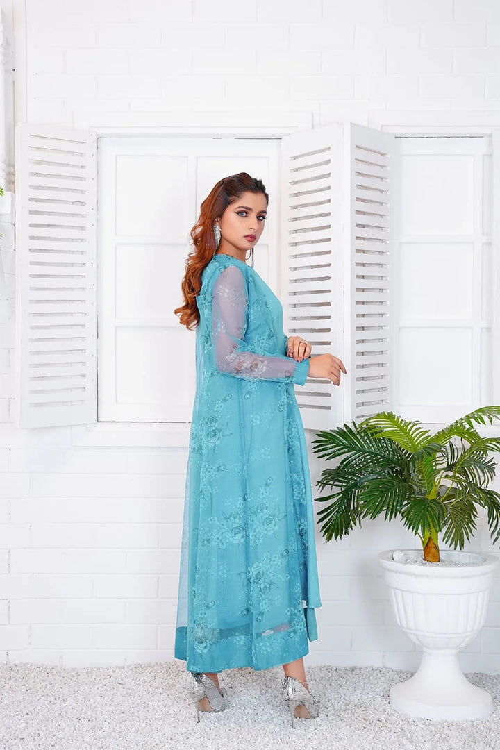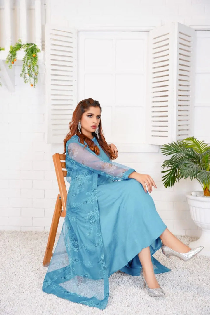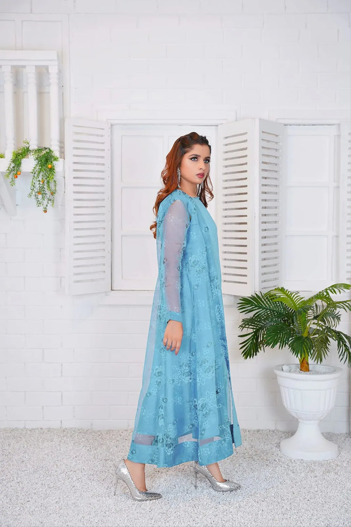 Details: This Sky blue shrug with floral print made in soft organza fabric features a front-open silhouette and a flared hemline.