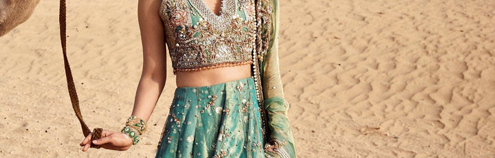 This aqua lehnga cholli is delicately crafted with hand worked floral vines in beautiful shades of peach and yellow silk thread which pops against its base colour with sophistication. Our floral patterns are worked onto this garment lovingly using purely hand-worked techniques.