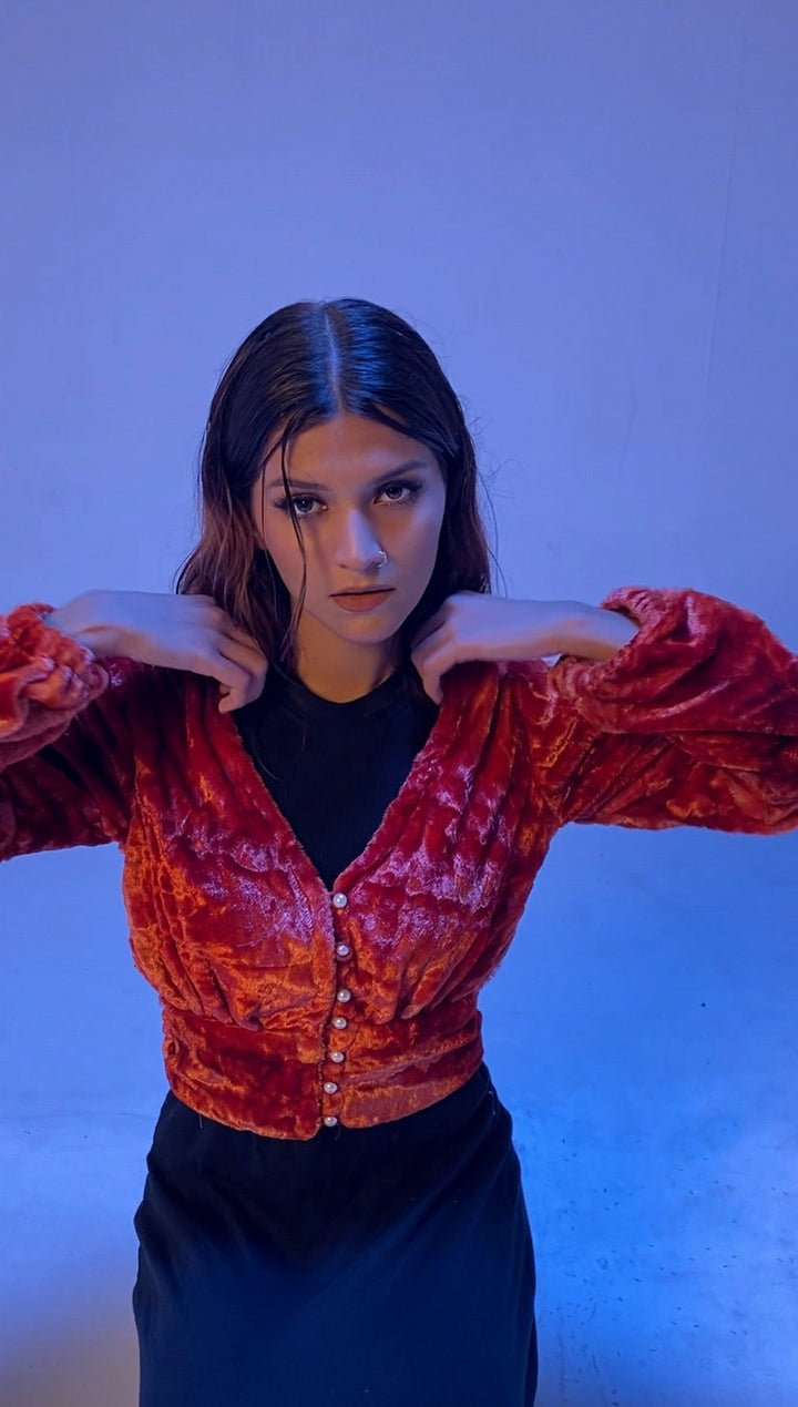 Relaxed in fit, chic in style, this crop top is cut from sheeny velvet fabric with a row loop buttons at the front and a plunging collar to amp up the flirtatious vibes. The long sleeves drape so naturally with elastic cuffs. Team up with high waisted skinny jeans will look great!