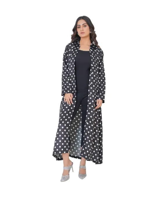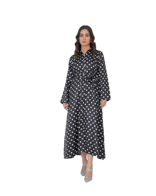 Embrace timeless elegance with this stunning black silk maxi dress from our Western collection. Adorned with classic white polka dots, this dress exudes sophistication while offering a fluid, graceful drape. The button-down front adds versatility, while the waist belt cinches perfectly for a flattering silhouette. With full sleeves and a flowing design, it’s the perfect blend of modern chic and vintage charm. Ideal for brunch dates, evening soirées, or a polished daytime look—pair it with heels for refined glamour or sneakers for effortless street style