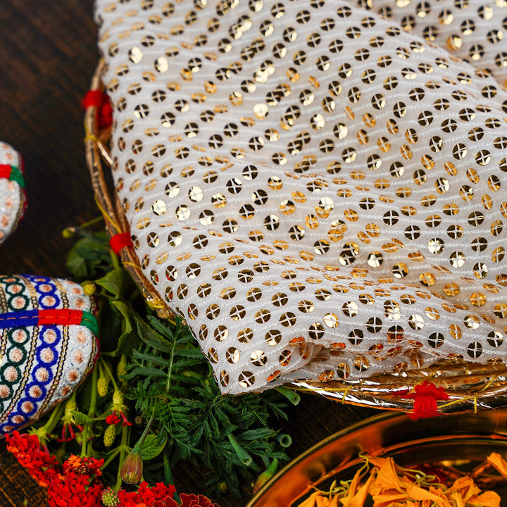 This article is made in Pure Bemberg Chiffon. This is embellished with High end State of the art foil print embroidery. Original sequin, Pure Tilla work and Viscose Thread. The base is dyeable in All pure colors. Tilla and sequins will not pick the color and still remain shiny after dyeing. The article is in Wider Width and 2m is enough for any Size Shirt.