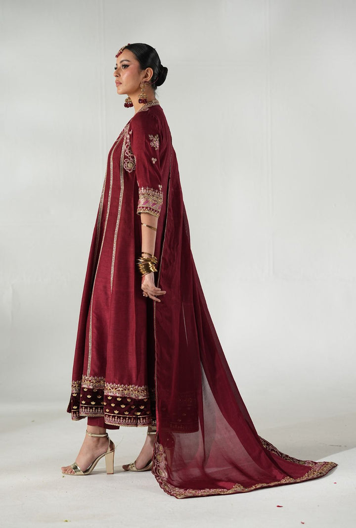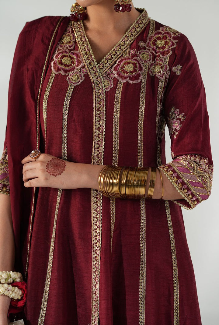 Regal allure in Ruby Raffia. This deep maroon Korean raw silk kalidar angrakha pishwas is embellished with resham embroidery, sequin work, and rich velvet borders. The short sleeves also feature resham and sequin embroidery. Complete with capris and a silk dupatta with embroidered borders and pallus, for a truly majestic look.