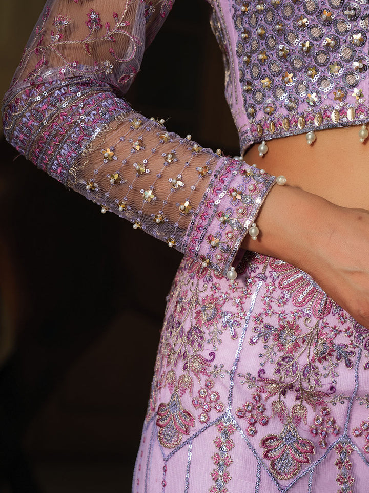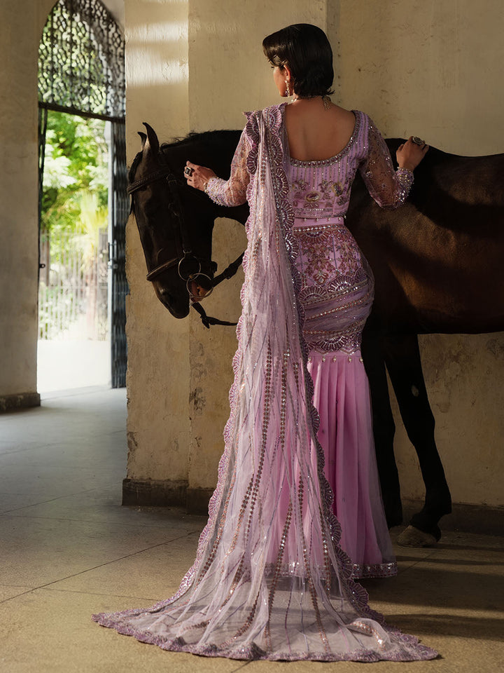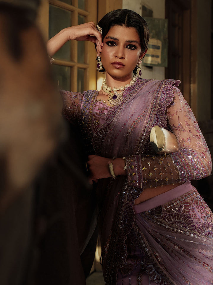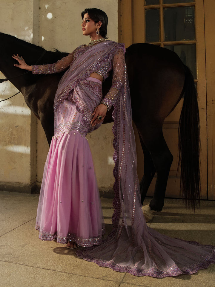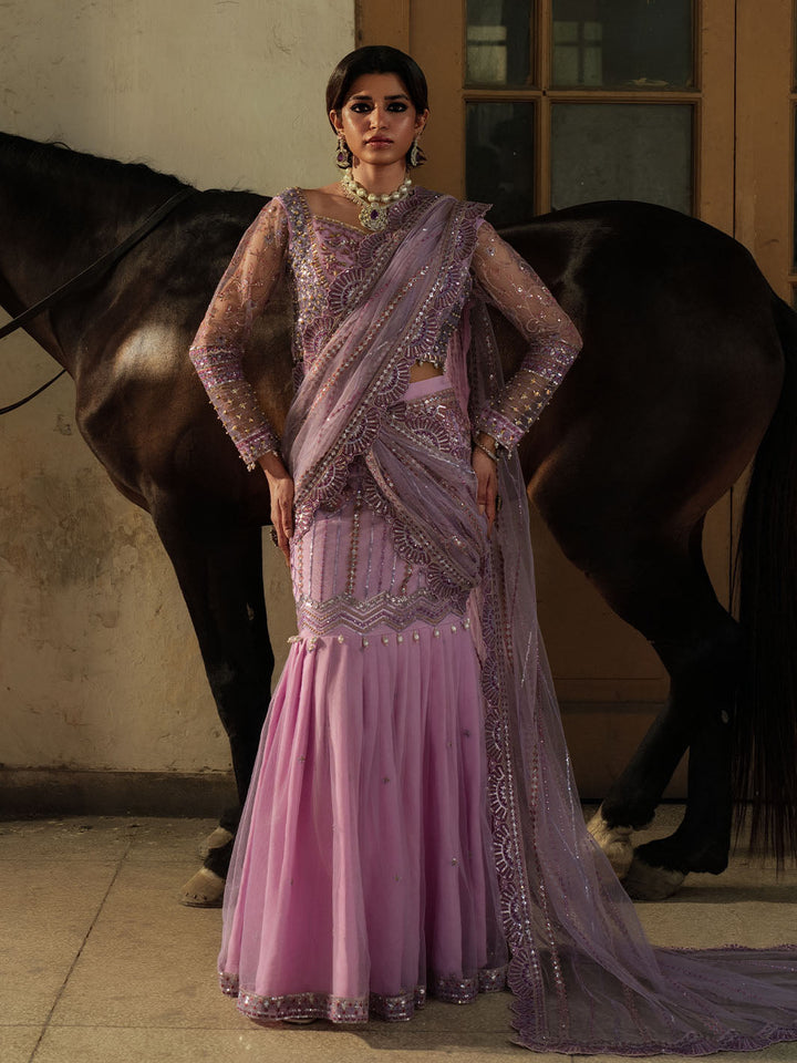 Graceful and striking, Sahiba is a lilac net saree ensemble featuring an intricately embroidered blouse with adda work and a draped saree skirt that flows effortlessly. Embellished with pearl hangings, colorful embroidery, and dazzling crystal work on the blouse and sleeves, this look brings festive glamour to life with tilla detailing and bold, elegant femininity.
