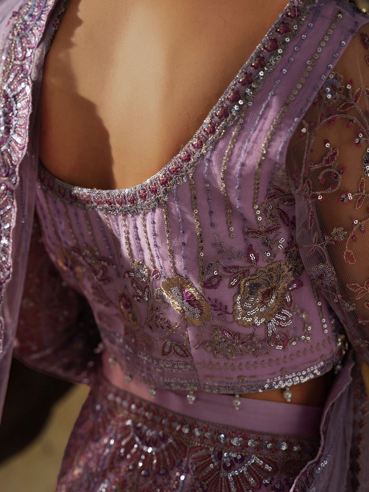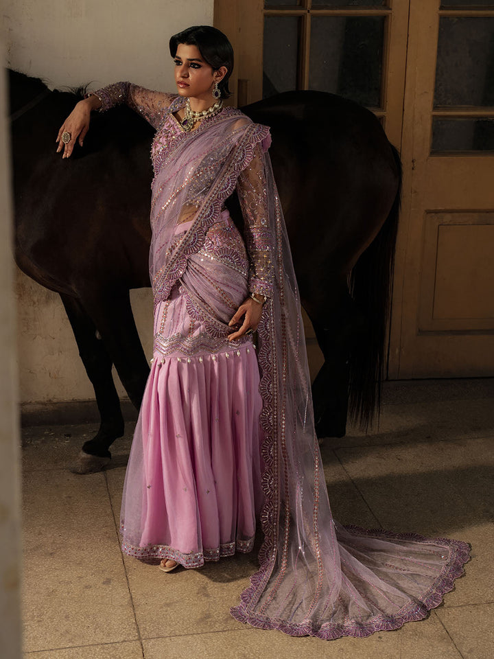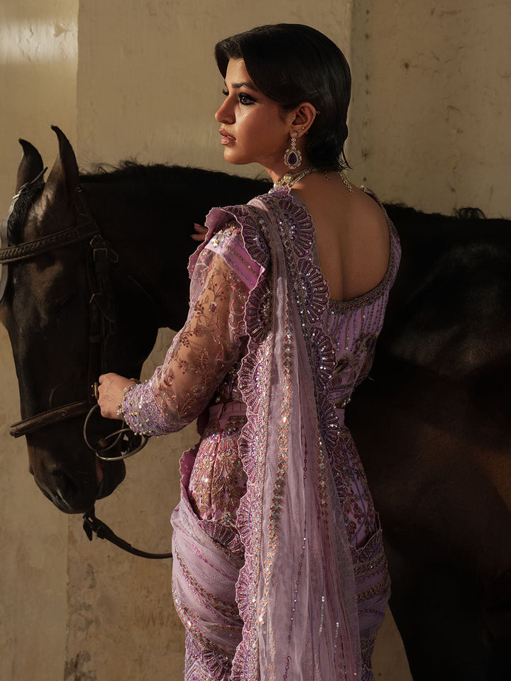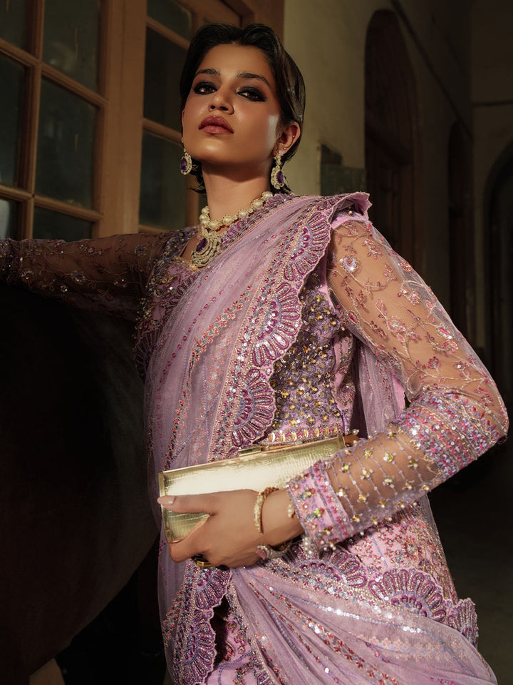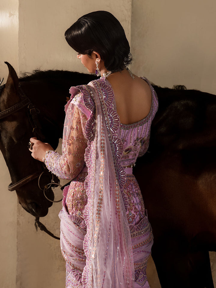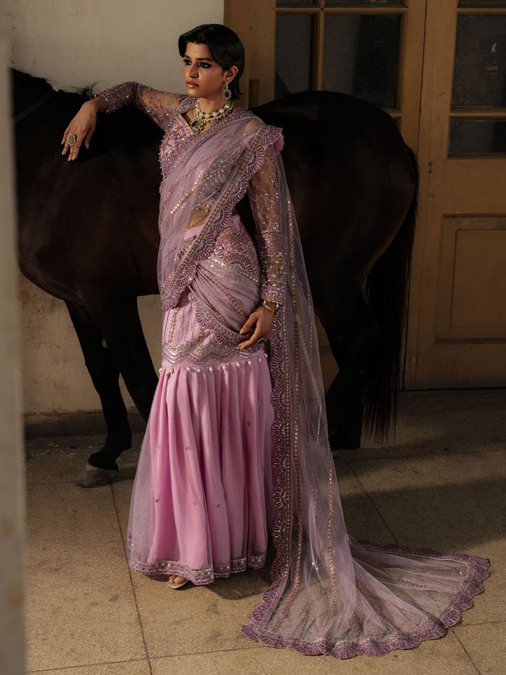 Graceful and striking, Sahiba is a lilac net saree ensemble featuring an intricately embroidered blouse with adda work and a draped saree skirt that flows effortlessly. Embellished with pearl hangings, colorful embroidery, and dazzling crystal work on the blouse and sleeves, this look brings festive glamour to life with tilla detailing and bold, elegant femininity.