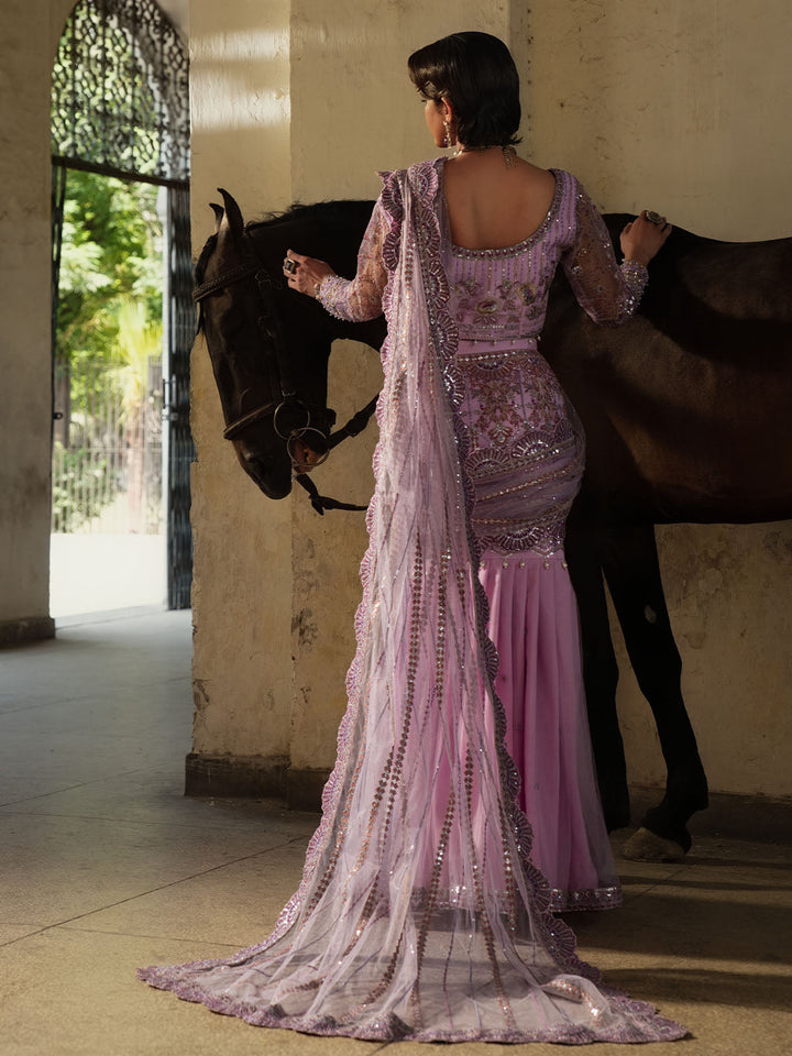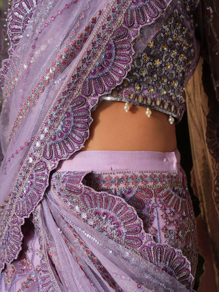 - Lilac Net Embroidered draped Saree skirt with Pallu