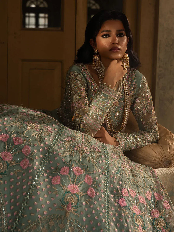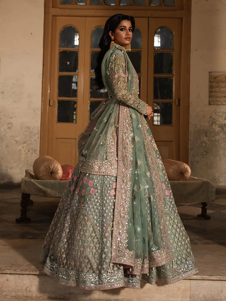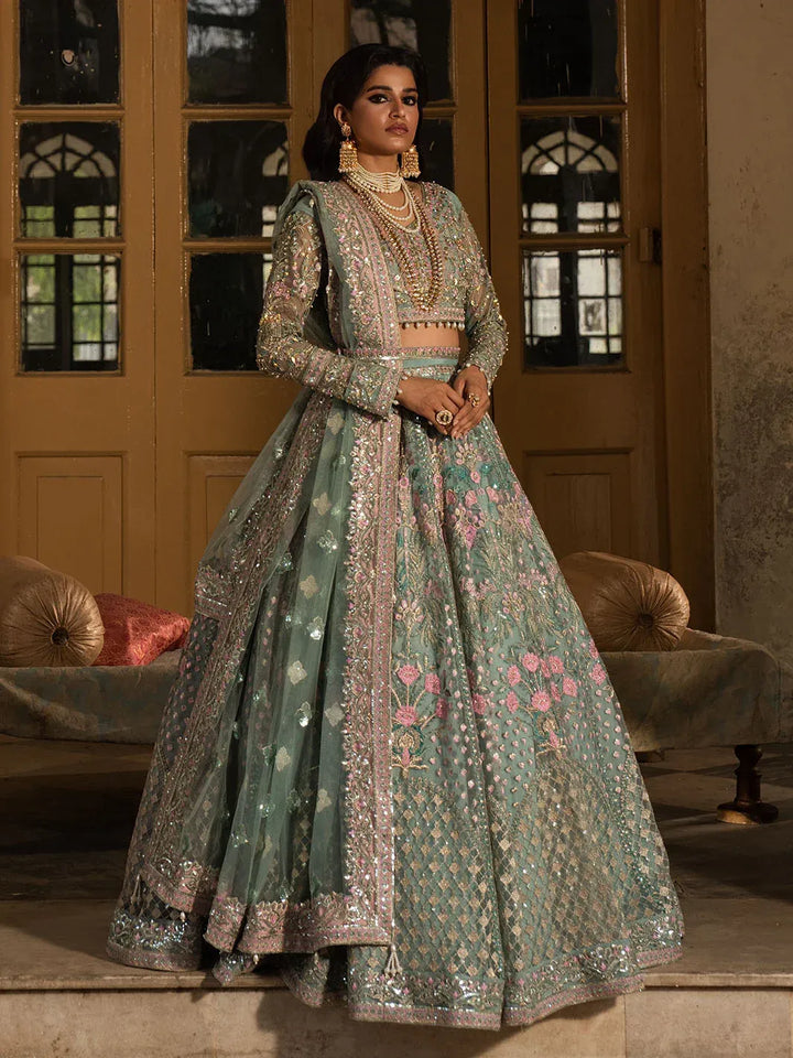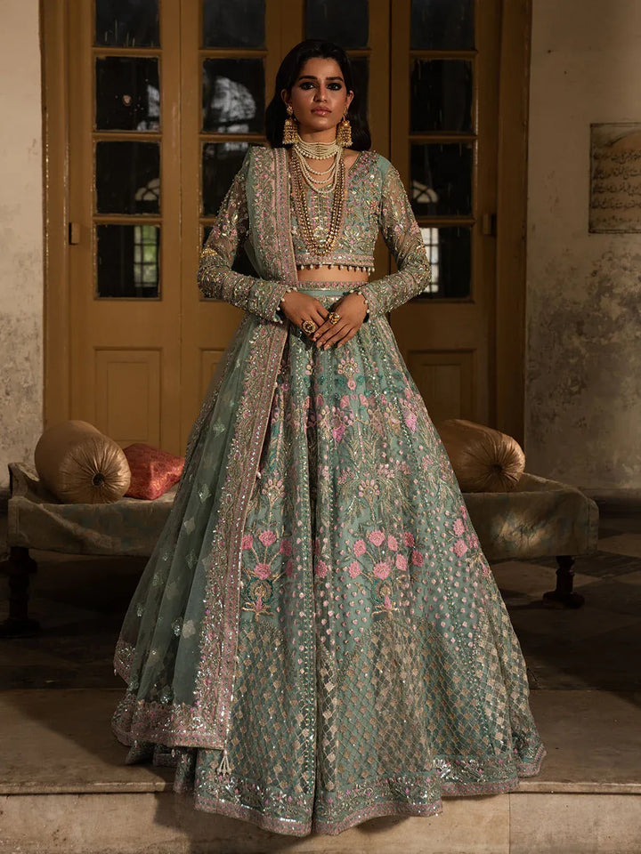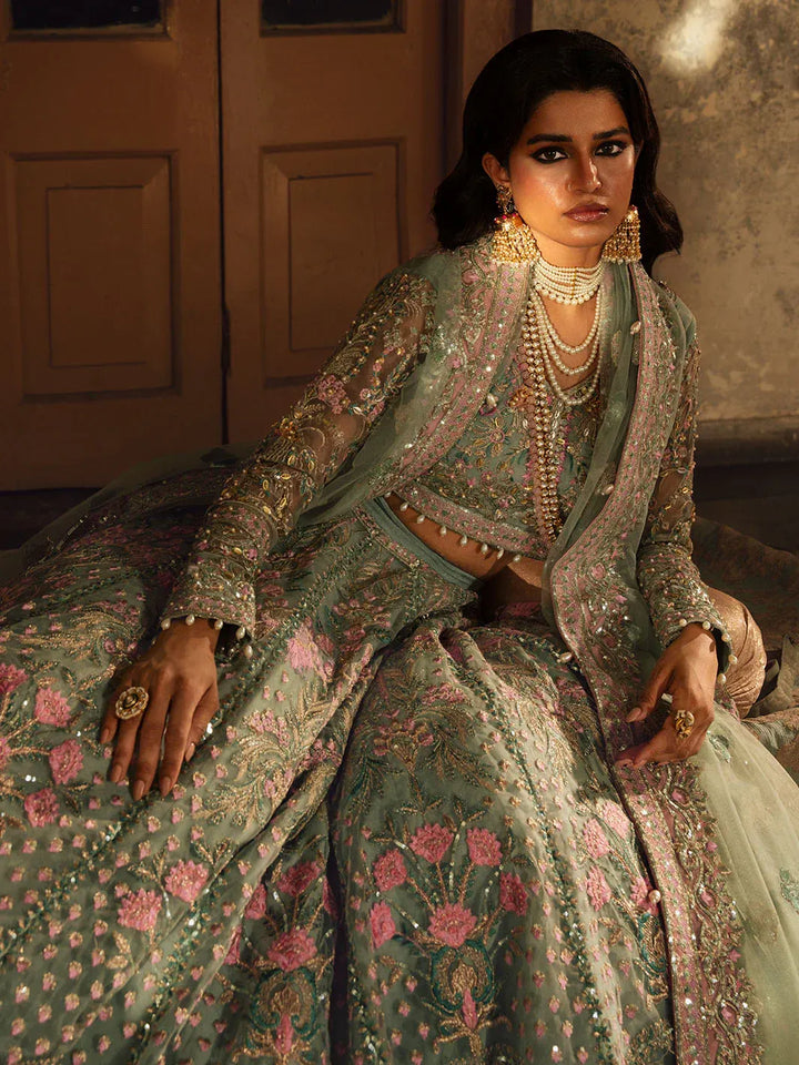 Fresh and ethereal, Saman comes in a refreshing mint green hue, featuring a fully embroidered choli and lehnga paired with a matching dupatta. The outfit is detailed with pearl hangings on both blouse and dupatta, colorful embroidery, and rich tilla and sequin embellishments, making it a soft yet regal choice for festive celebrations.
