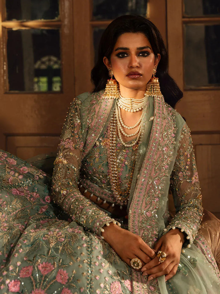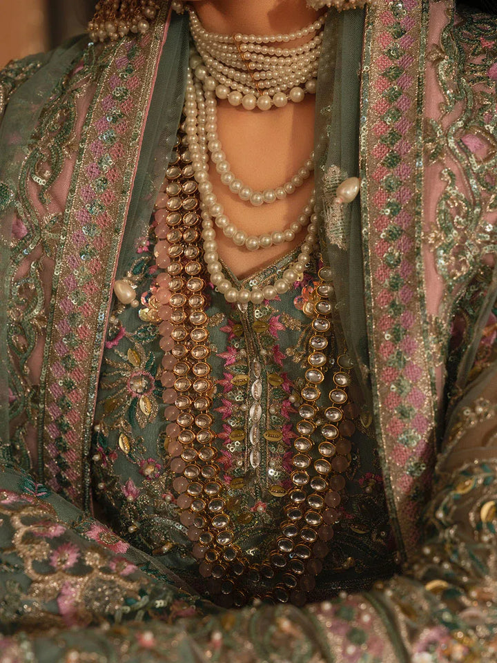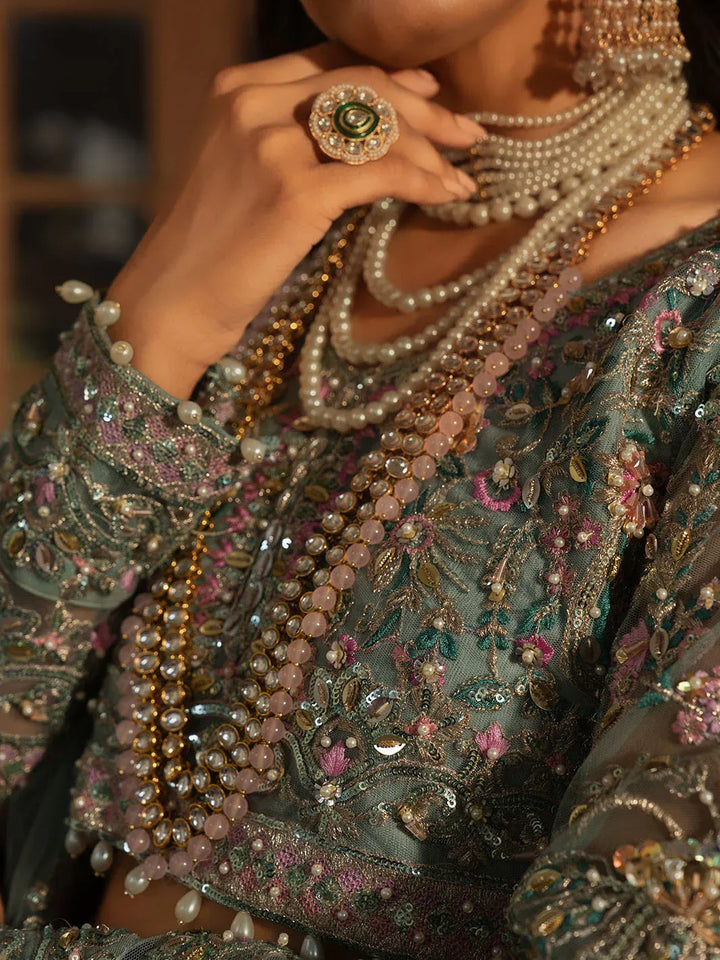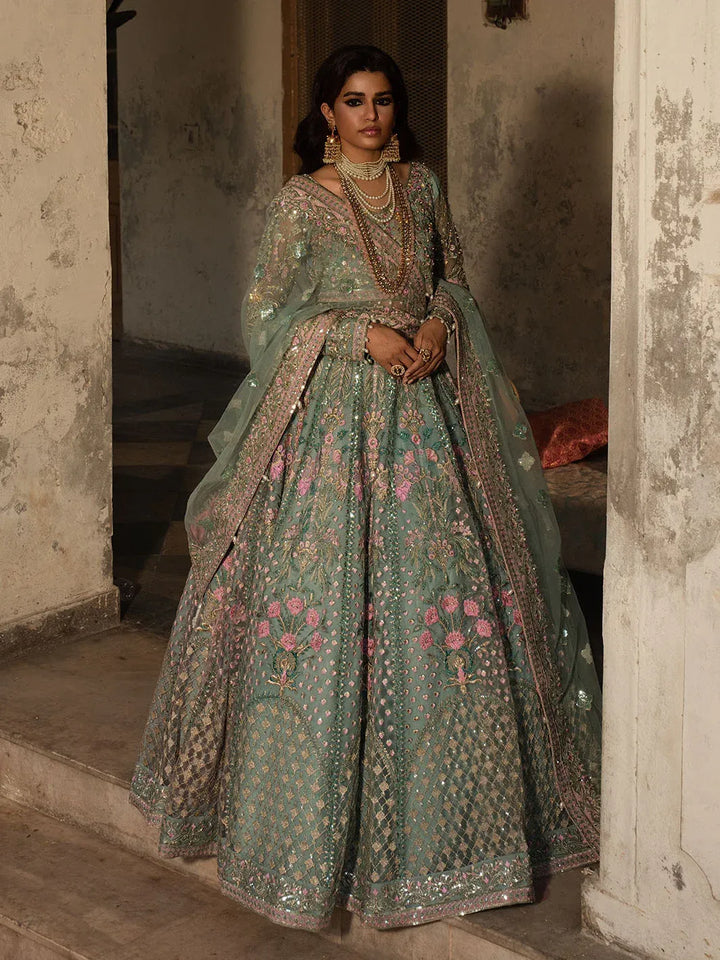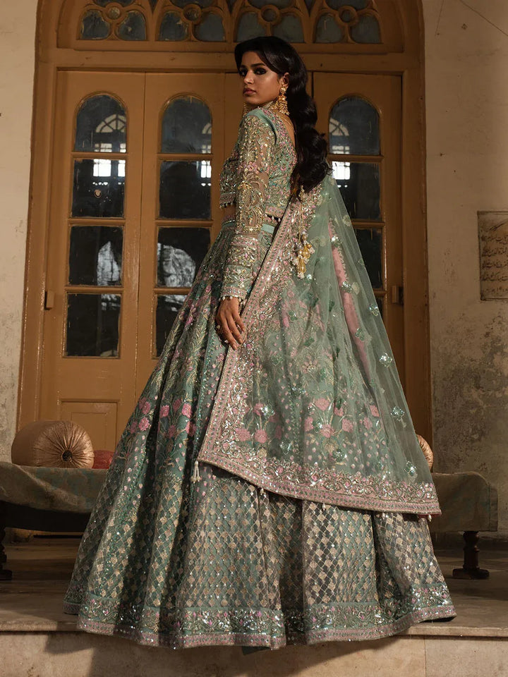 Fresh and ethereal, Saman comes in a refreshing mint green hue, featuring a fully embroidered choli and lehnga paired with a matching dupatta. The outfit is detailed with pearl hangings on both blouse and dupatta, colorful embroidery, and rich tilla and sequin embellishments, making it a soft yet regal choice for festive celebrations.