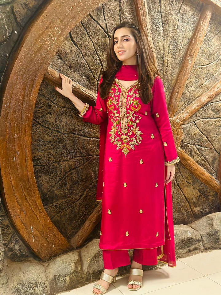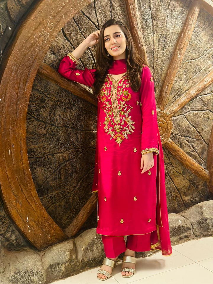 This gorgeous hot pink color is season’s favorite. This stunning shirt is made on raw silk canvas featuring delicate hand embellished neckline. The shirt is donned with sophisticated floral pattern which makes is wearable on any festive occasion .It comes with a chiffon dupatta with sequence chan allover with lace finishes.