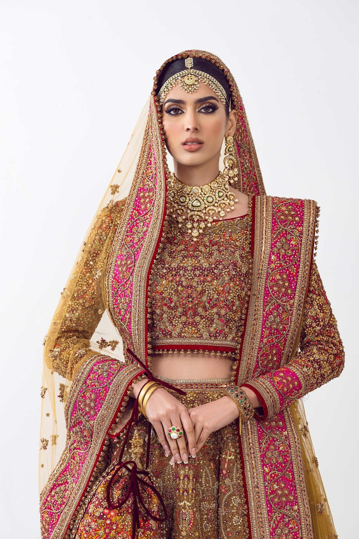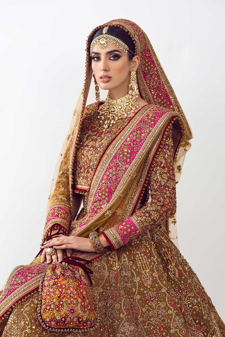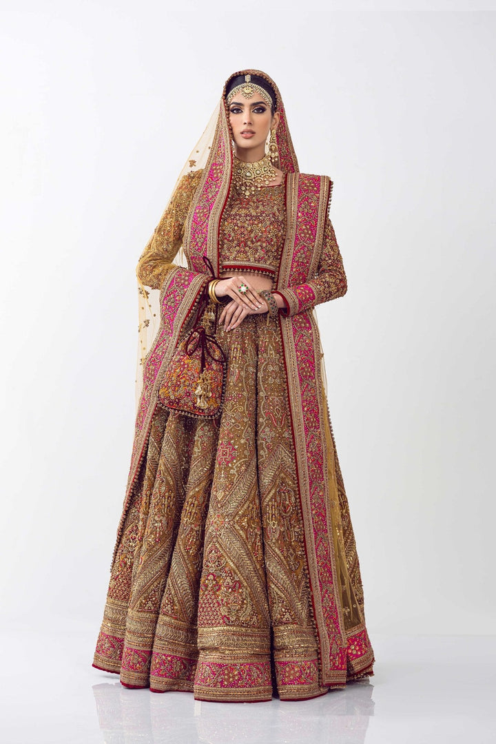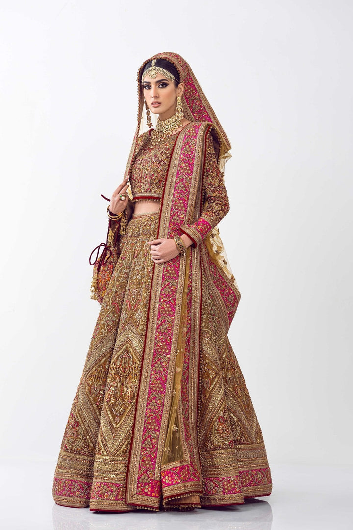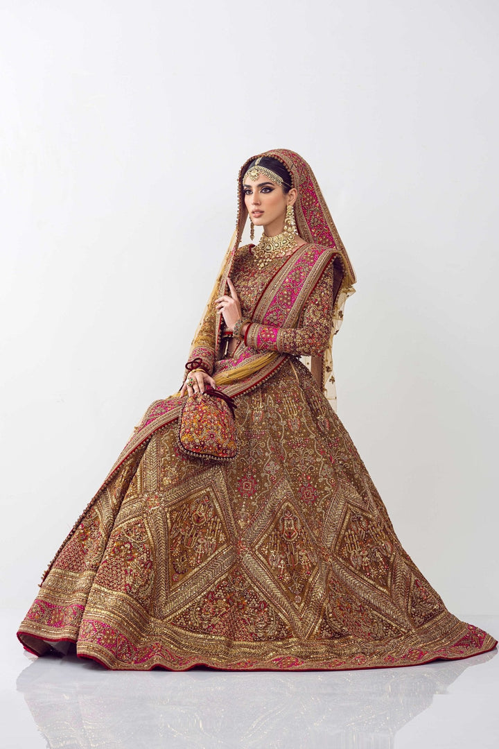 Fahad Hussayn Wedding Essentials feature the traditional and most wanted festive wear; a heavily hand and machine embroidered anarkali paired with a gharara and a beautiful dupatta. The dress has crystals adorned on it along with sitara work in shades of gold that illuminate its rust surface.