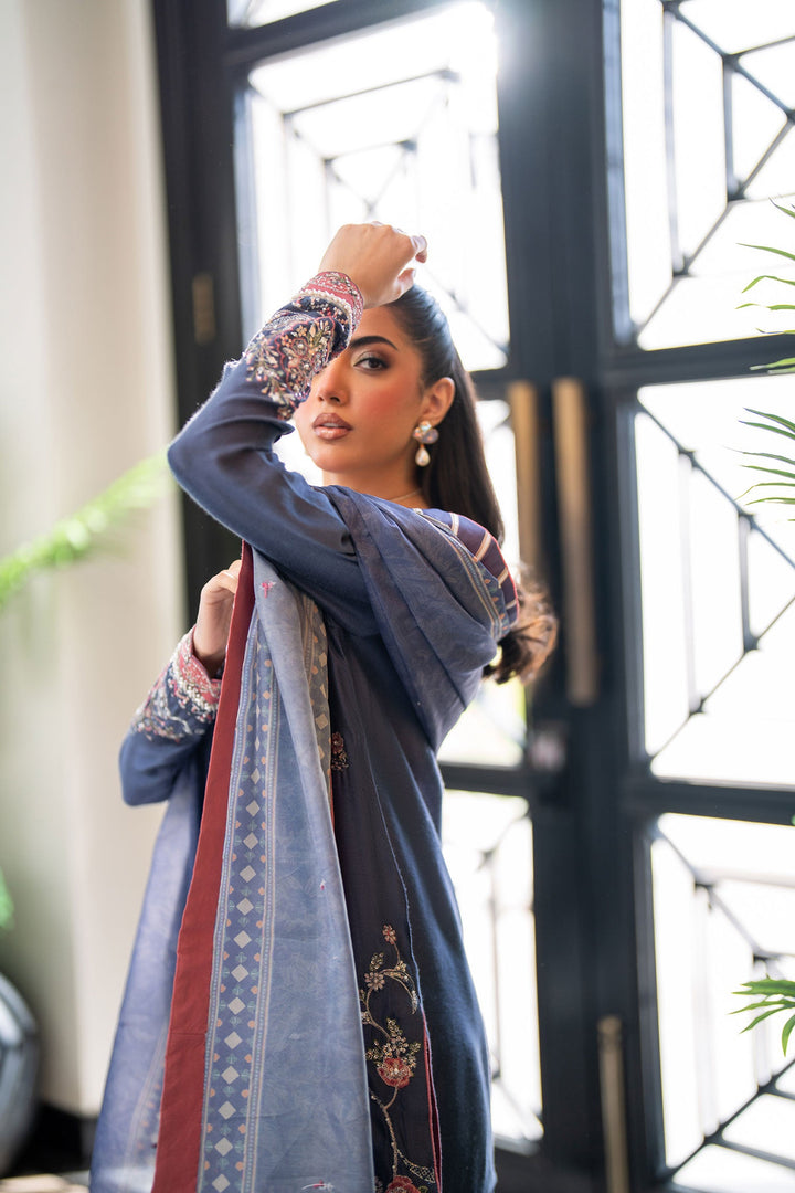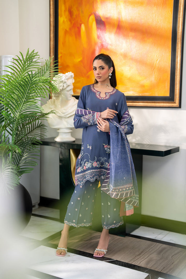 This purple three-piece luxury ensemble is adorned with delicate embroidery and intricate hand embellishments, creating a look that is both refined and timeless. The shirt features exquisite detailing that enhances its sophisticated charm, while the embroidered dupatta and matching embroidered pants complete the ensemble with effortless grace.