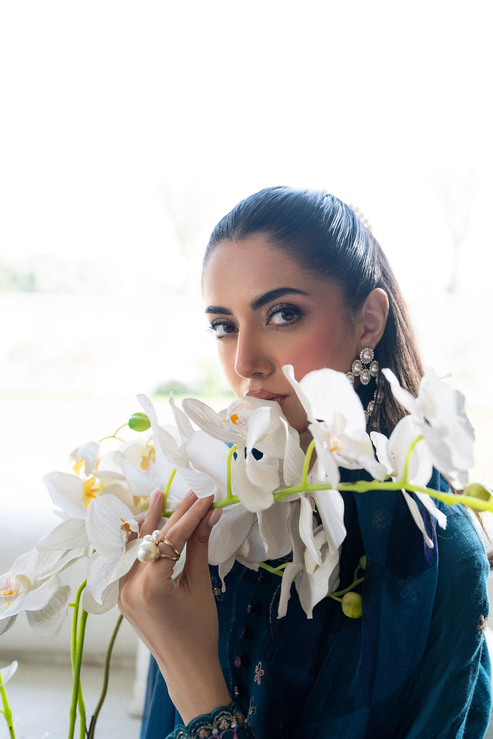 Make a statement in this exquisite BLUE three-piece ensemble. The embroidered shirt, adorned with intricate lace accents and embellishments, radiates timeless charm. Paired with a beautifully embroidered dupatta and matching embroidered straight trousers, this outfit blends sophistication with elegance. Perfect for festive gatherings, it showcases a vibrant yet graceful aesthetic.