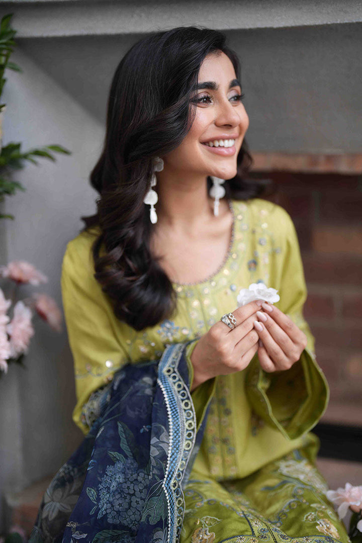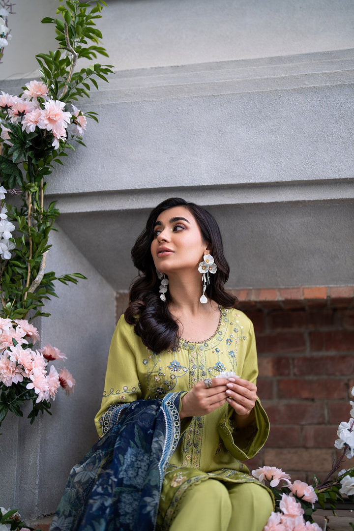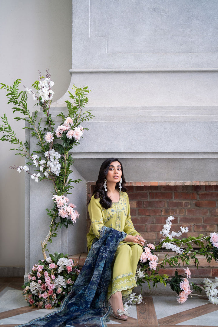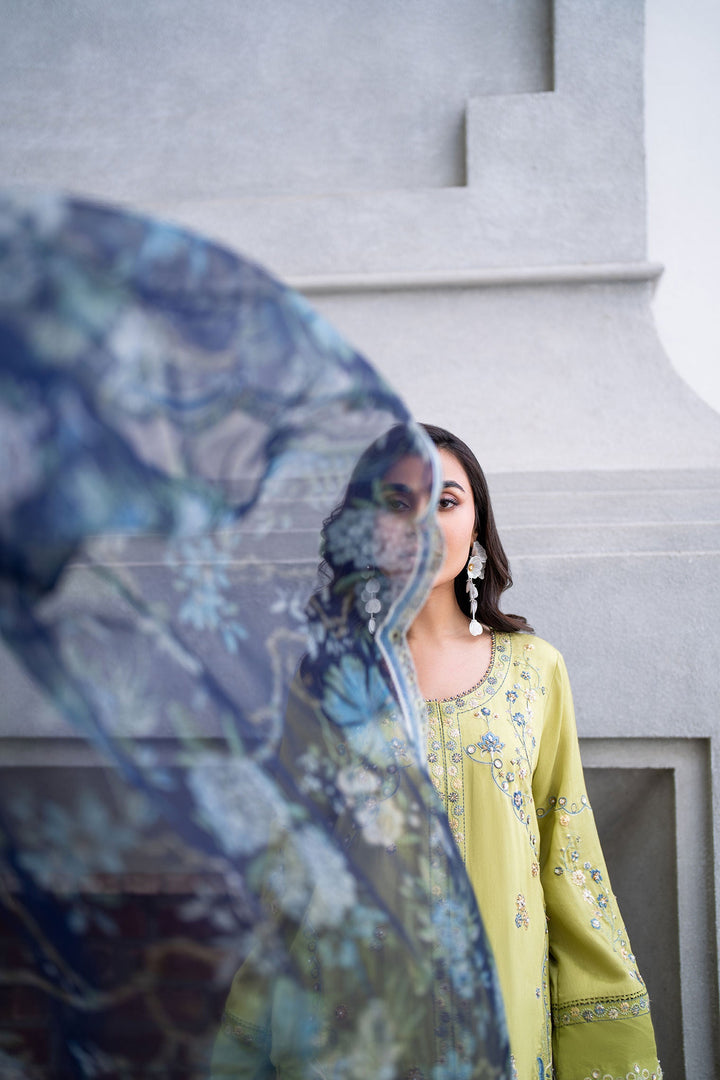 A harmonious blend of classic and contemporary elegance, this green three-piece luxury ensemble is a testament to exquisite craftsmanship. The shirt features delicate contrasting blue embroidery, intricate hand embellishments, and embroidered laces, adding depth and sophistication to its timeless silhouette. Paired with matching embroidered pants and a floral-printed embroidered dupatta in a contrasting blue hue, this ensemble strikes the perfect balance between classic charm and contemporary refinement.
