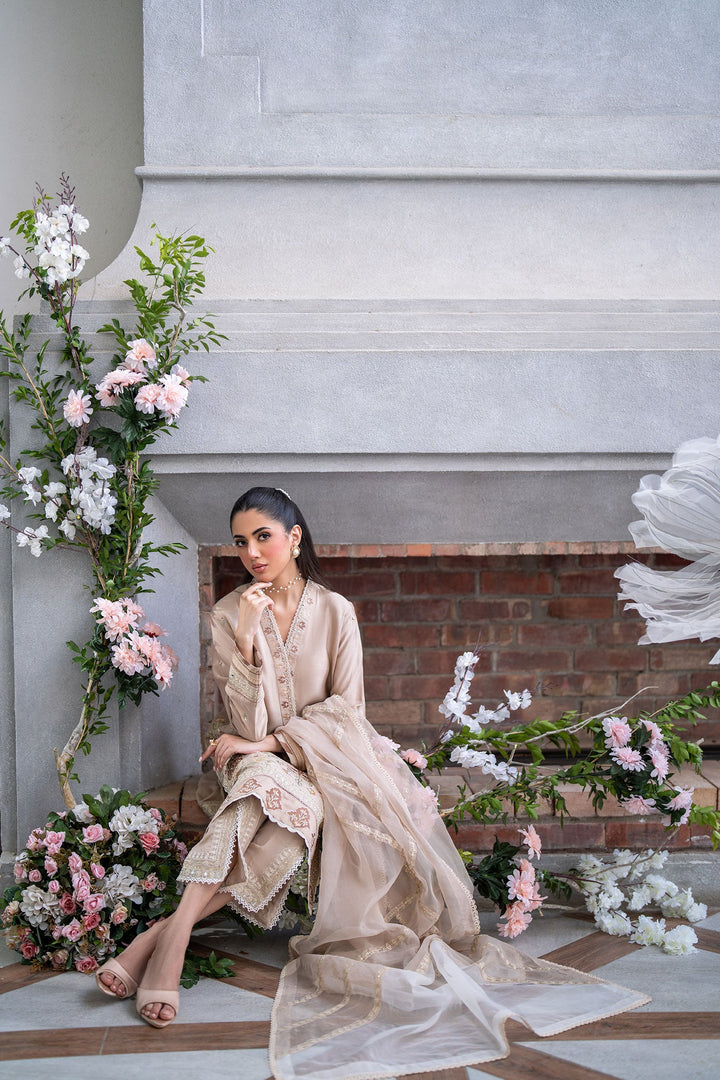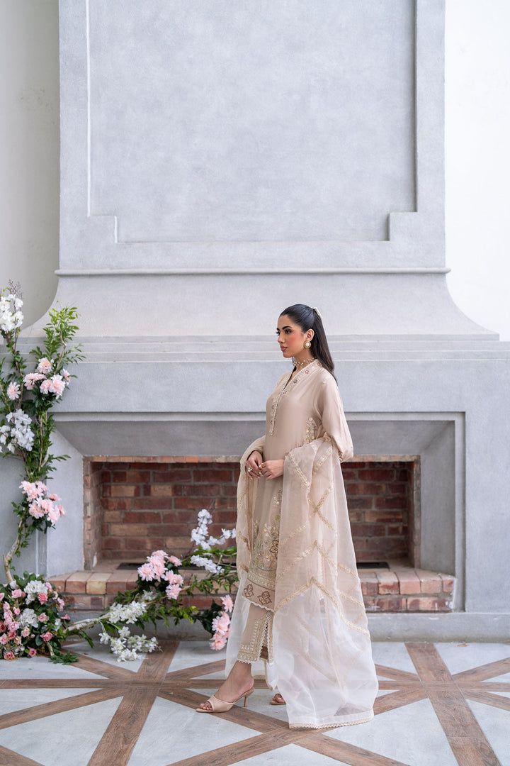 A timeless expression of grace, this beige three-piece luxury ensemble is adorned with delicate embroidery, intricate embellishments, and embroidered laces, creating an aura of refined sophistication. The elegantly embroidered straight pants and a beautifully detailed dupatta complete the look, adding a touch of effortless charm.