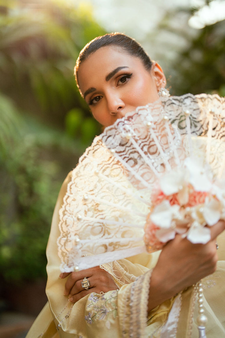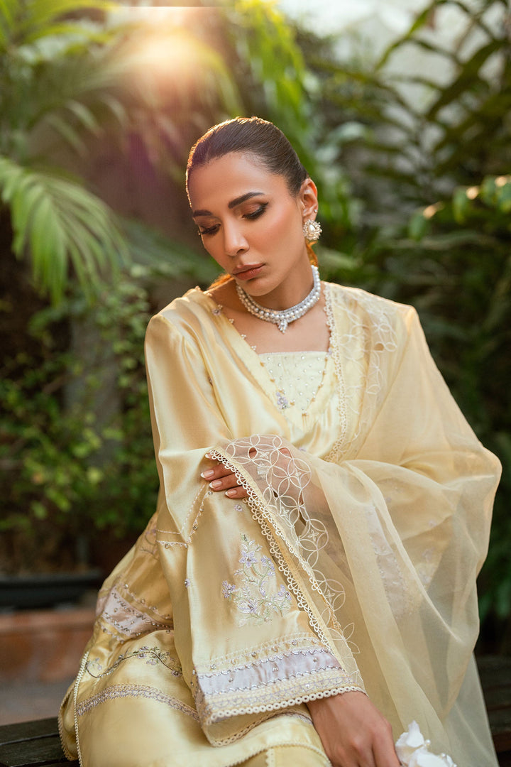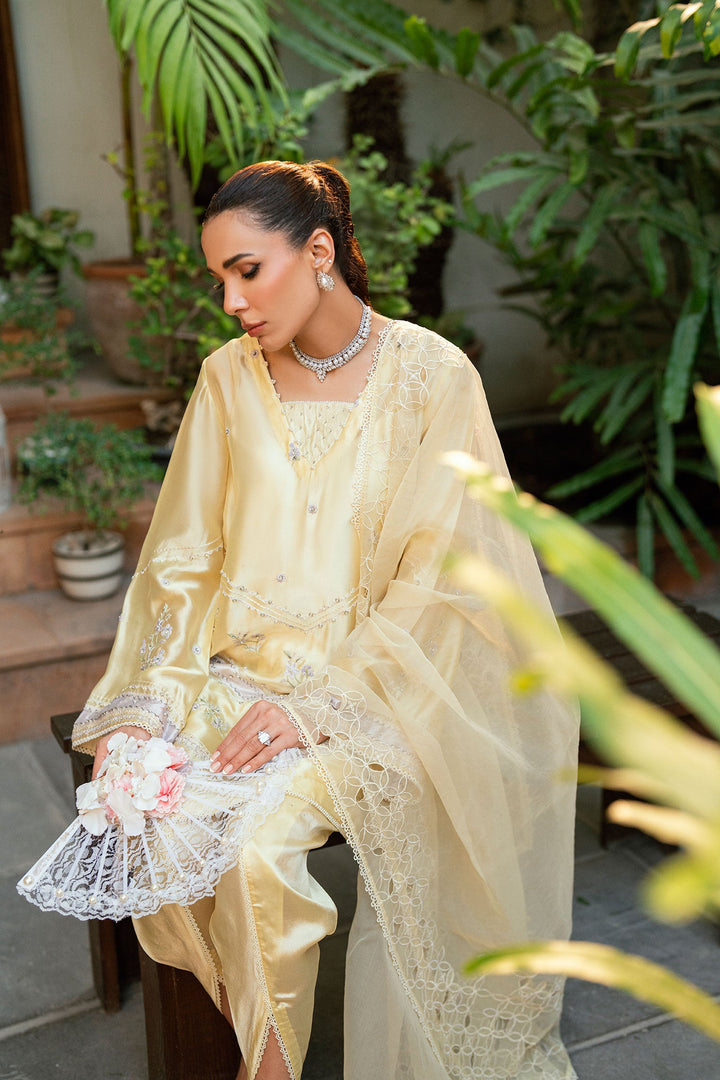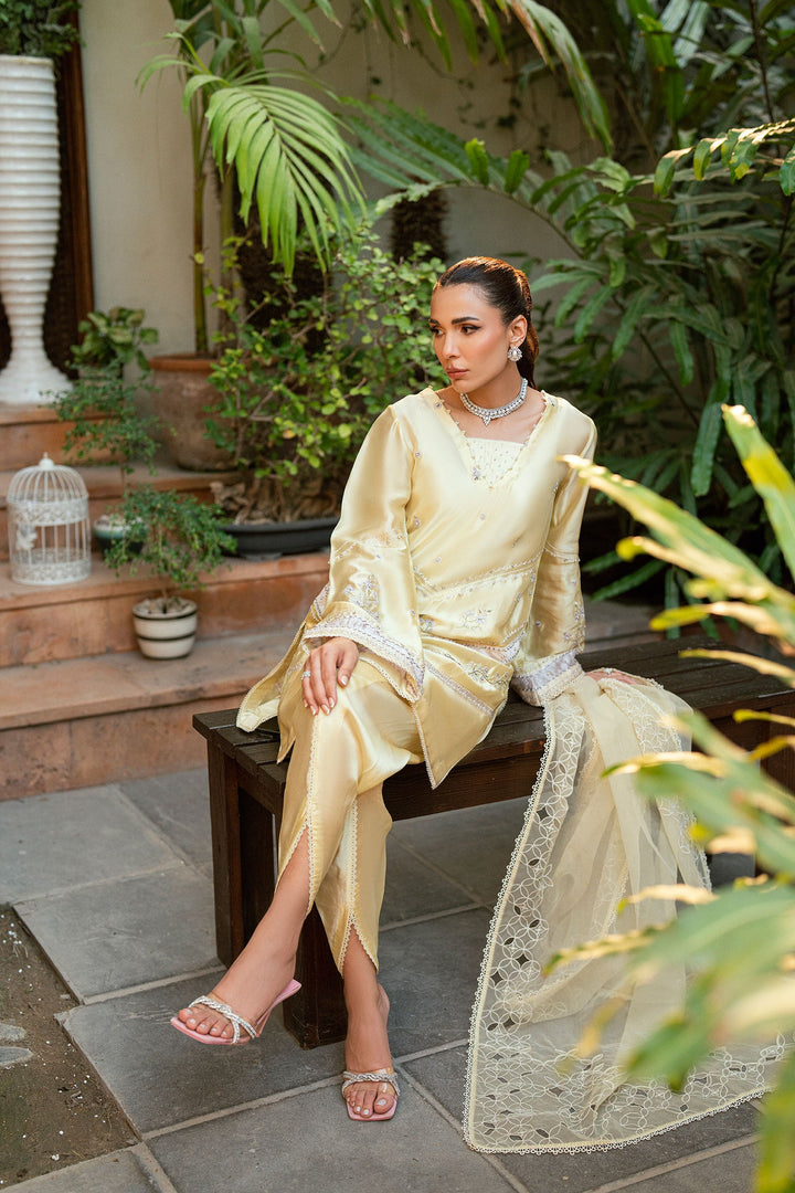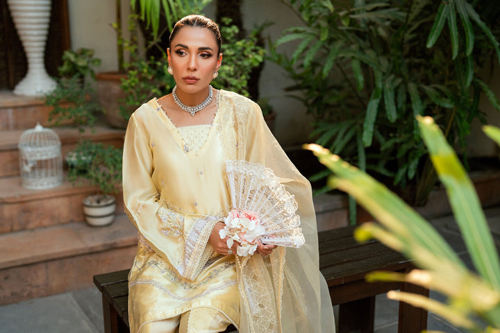 Radiate sunshine in this stunning yellow three-piece ensemble by Dhanak. Designed on luxe sheesha silk fabric, the shirt features intricate embroidery and delicate embellishments that exude timeless charm. Paired with embroidered raw silk tulip pants and a coordinating dupatta, this outfit blends festive flair with refined elegance.