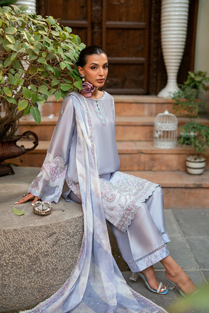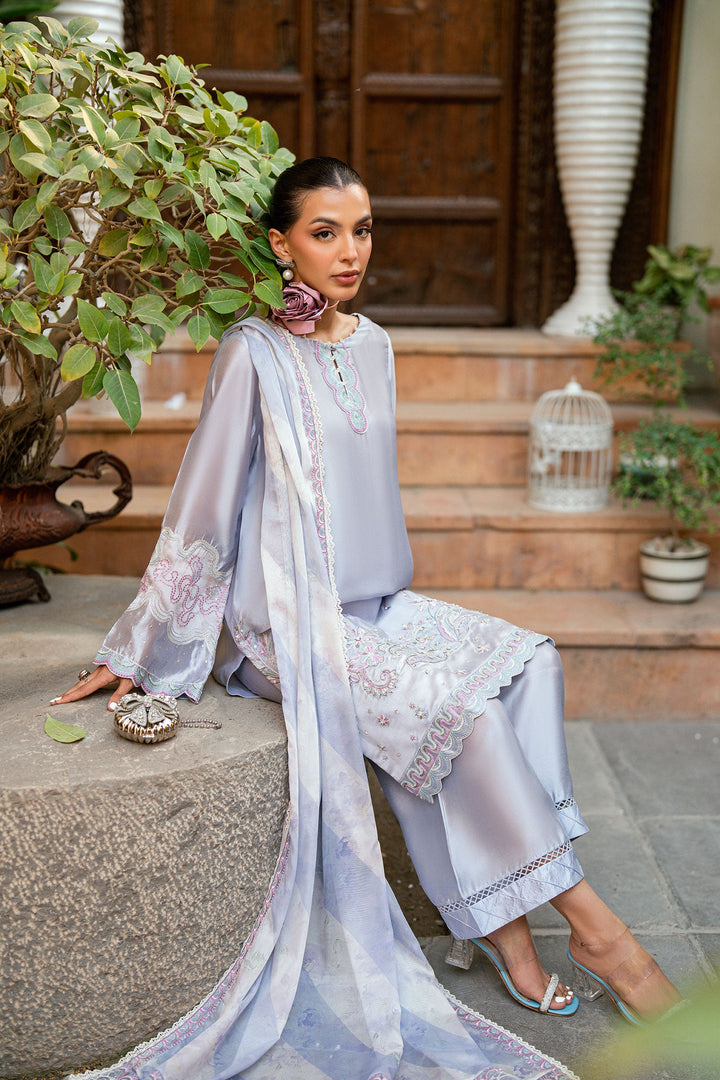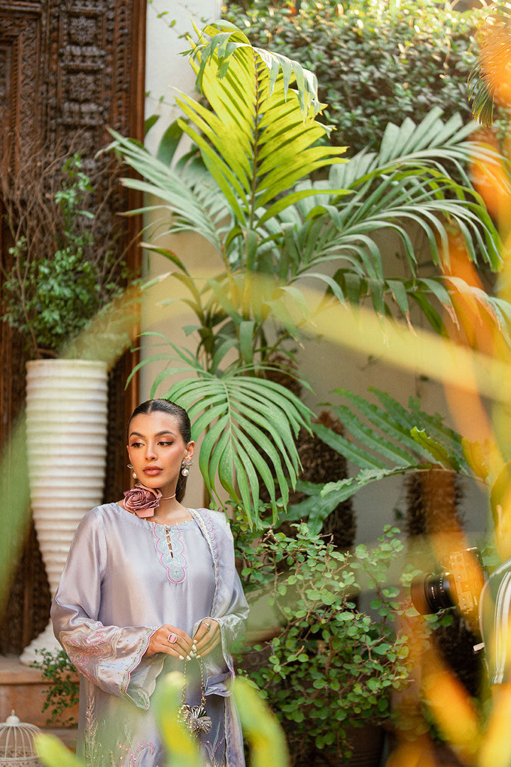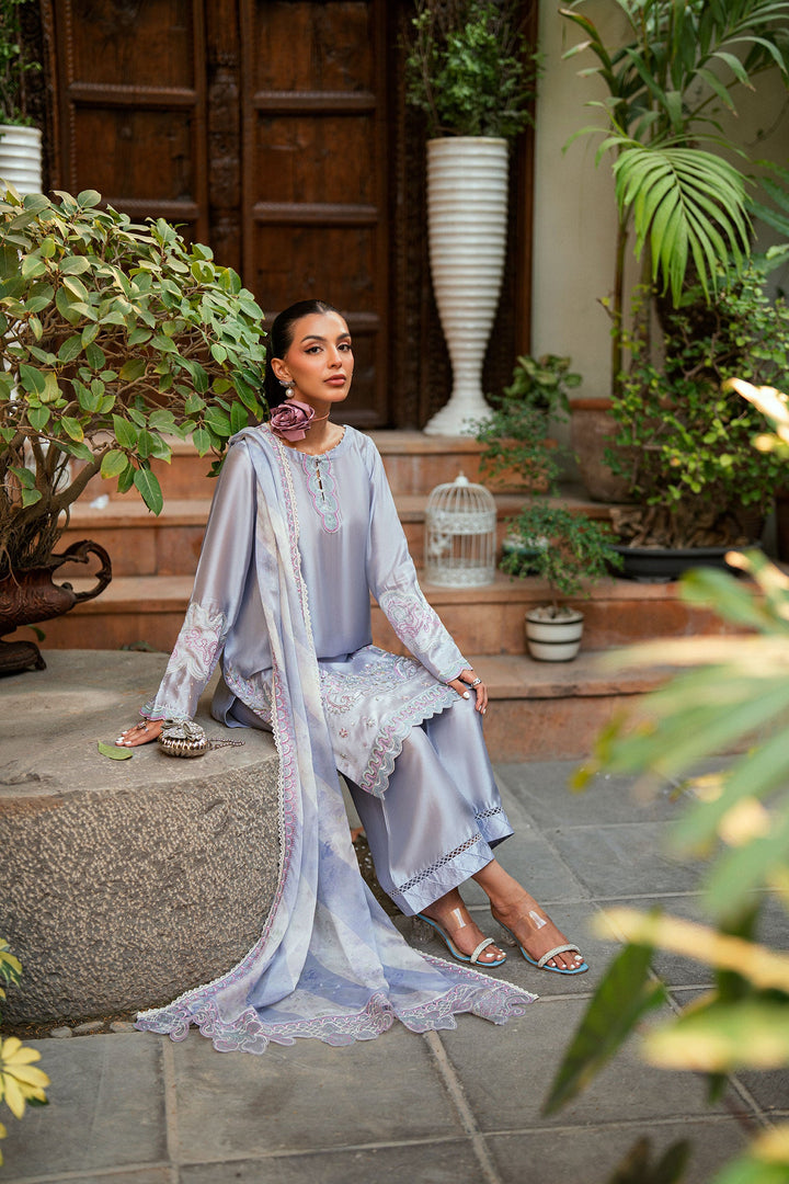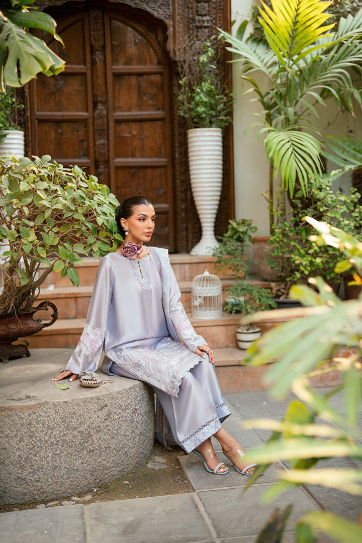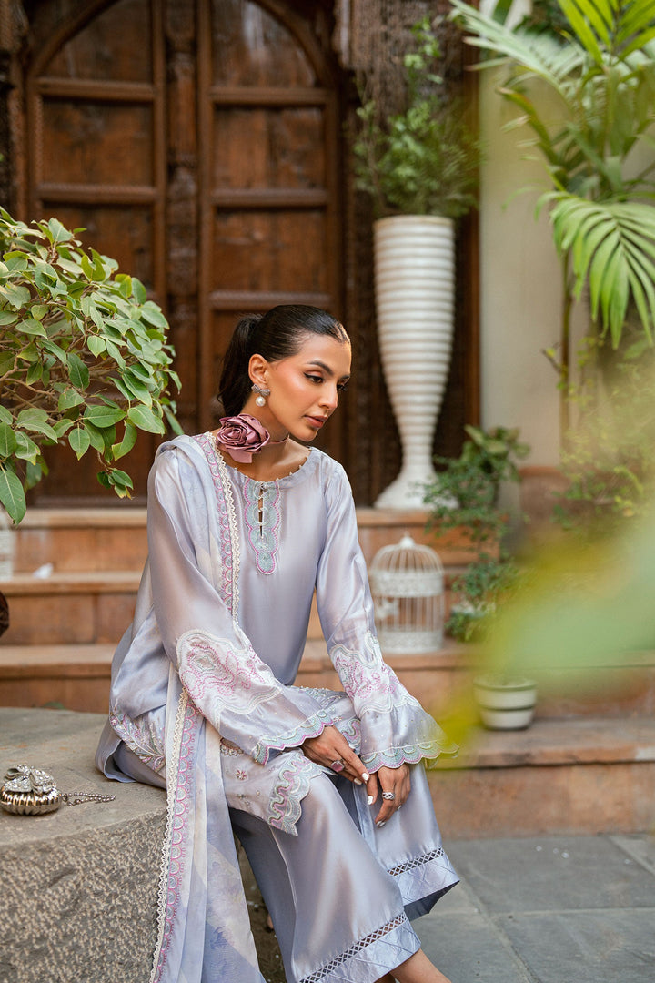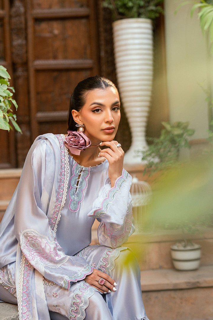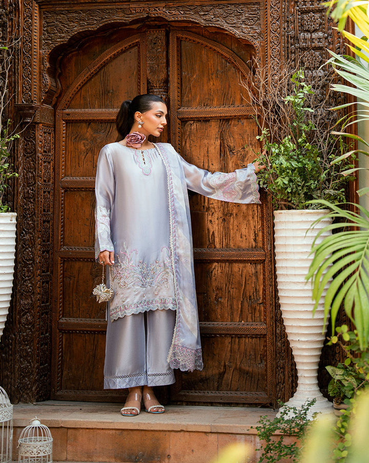 Designed on a light purple backdrop with contrasting accents, this ensemble is crafted from sheesha silk fabric. The shirt features ethereal embroidery and delicate motifs that reflect timeless charm. Paired with straight raw silk pants and a sheer matching dupatta, this look brings a regal presence to any occasion.