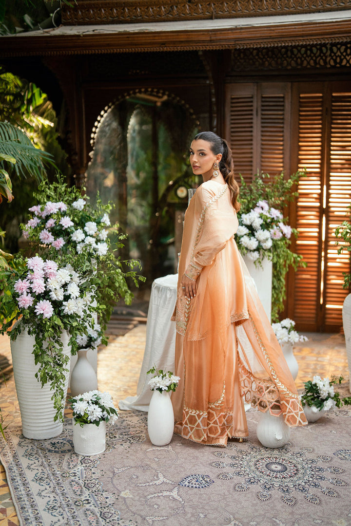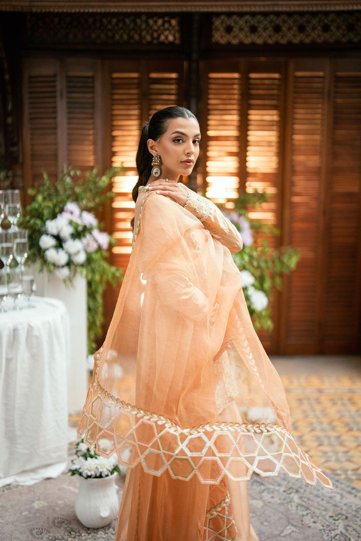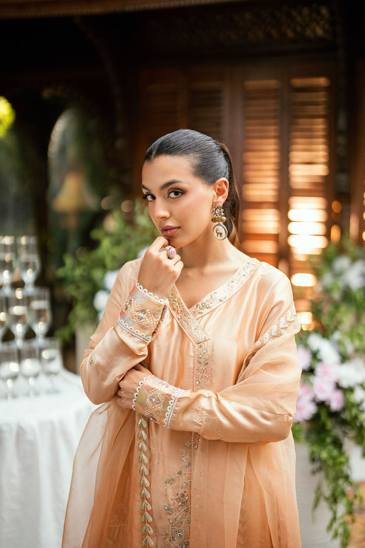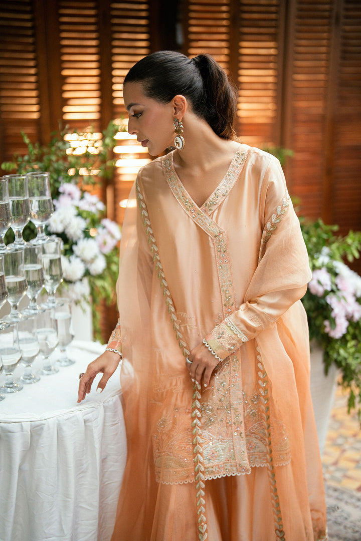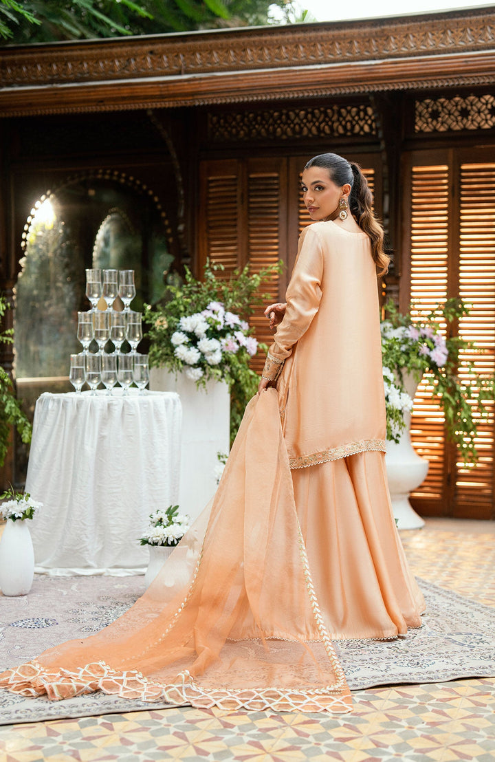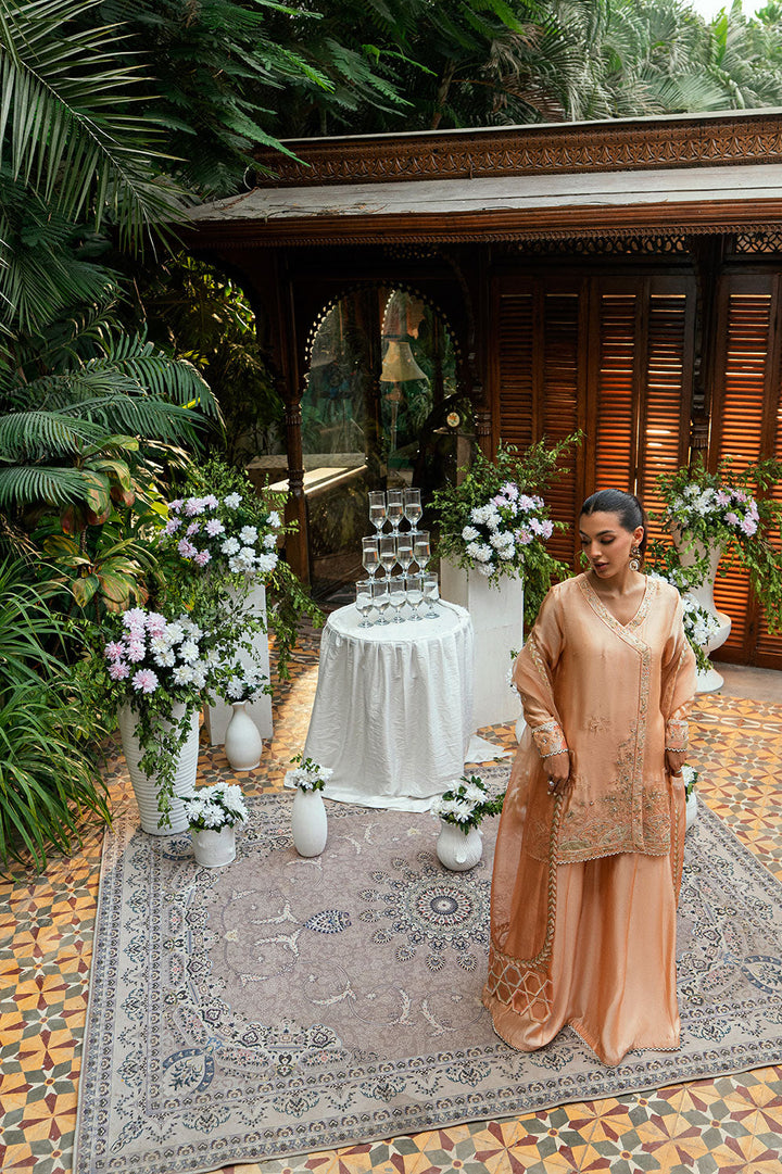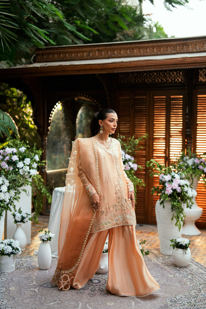 This three-piece luxury ensemble is a true summer indulgence. The sheesha silk shirt is beautifully adorned with delicate embroidery and signature motifs, complemented by flared raw silk pants that bring graceful movement to your look. Finished with a matching dupatta, it's a picture of understated luxury.
