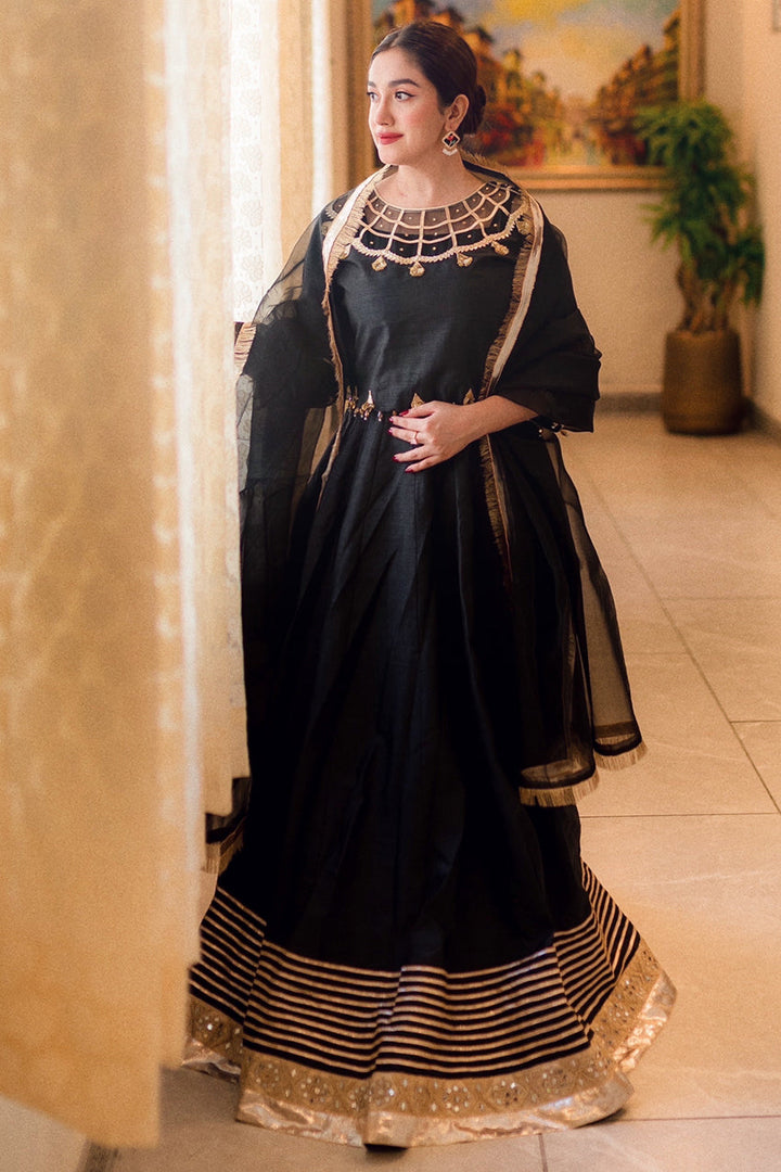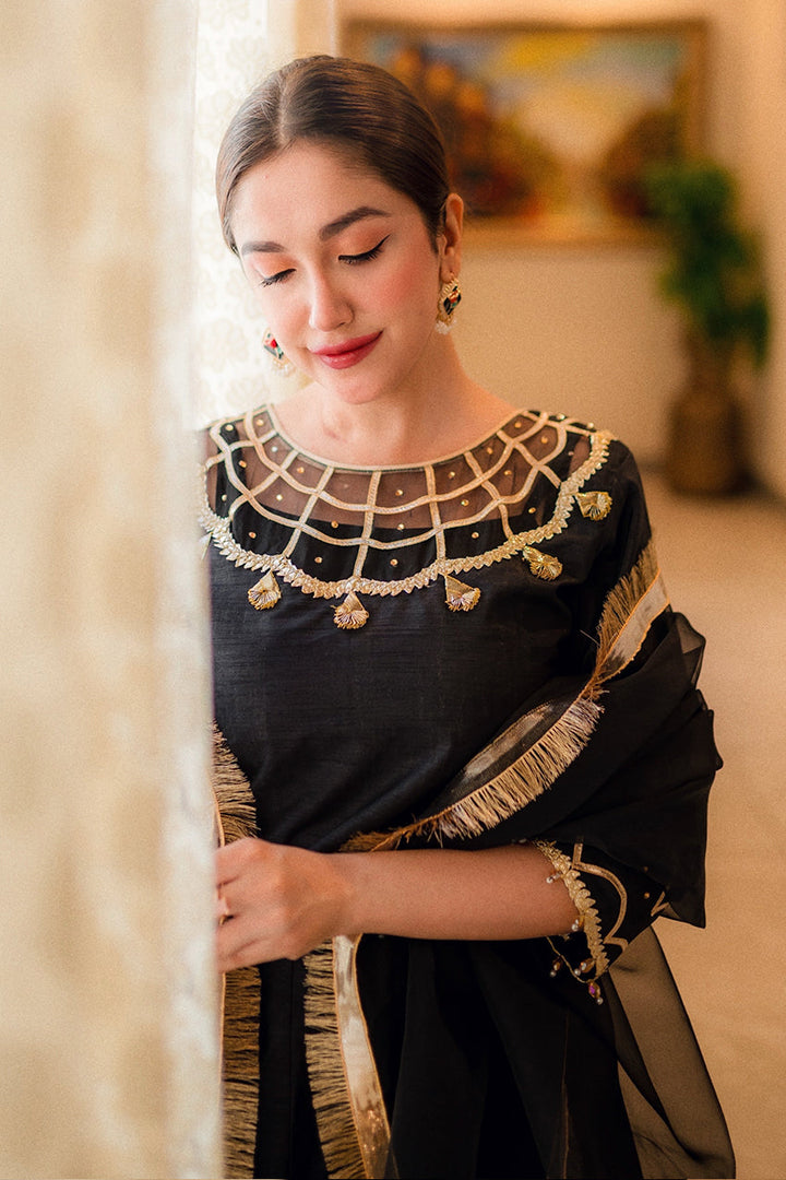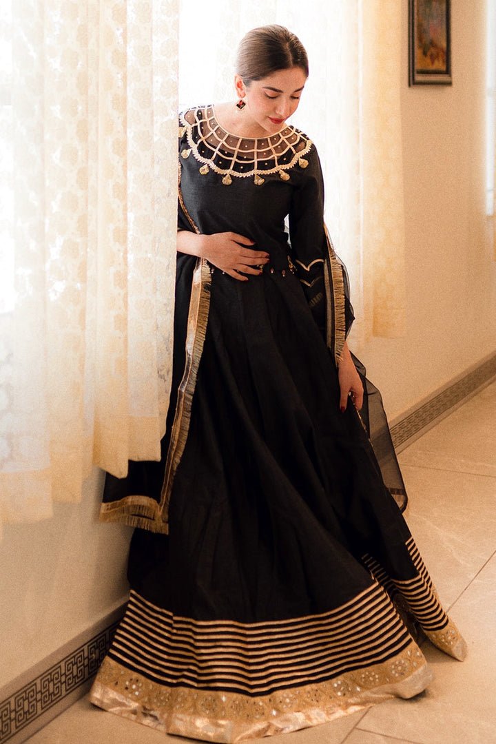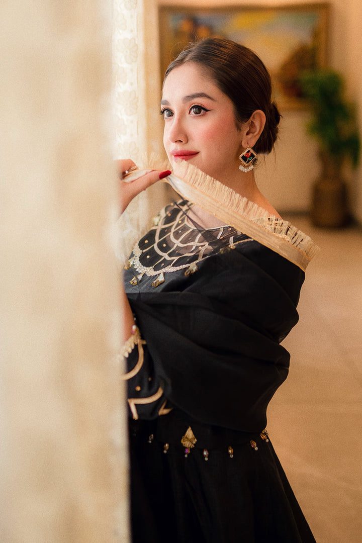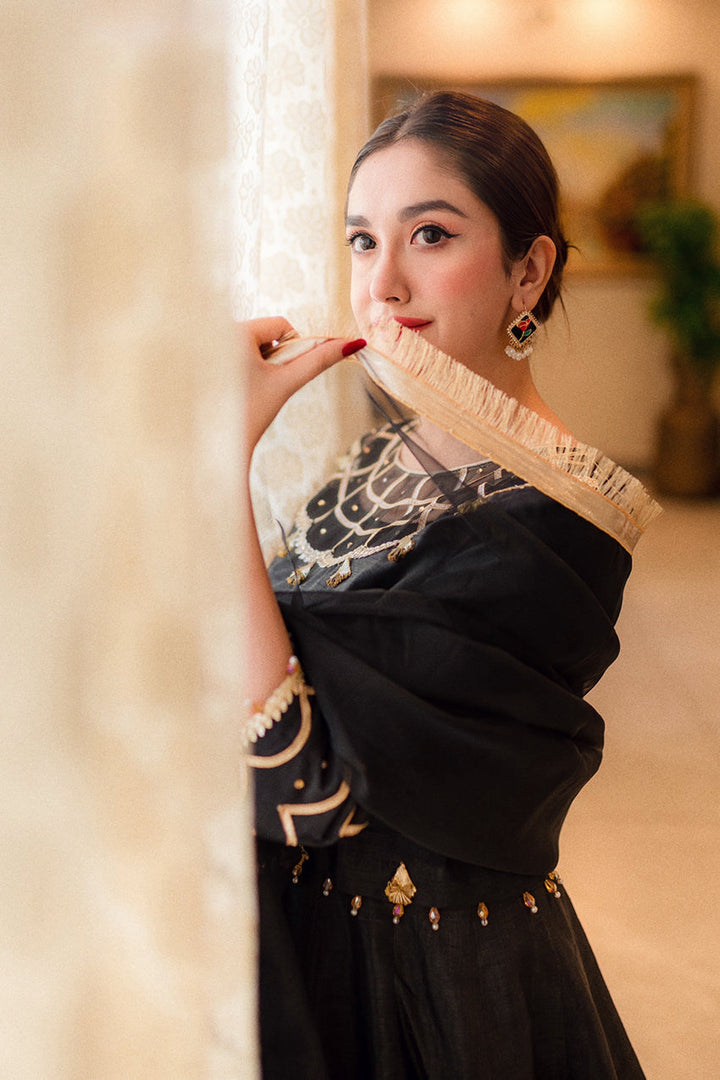 The captivating black rawsilk lehnga choli exudes timeless sophistication and refinement,elevated by intricate Charma Dori embellishment.Flowing black raw silk lehnga with delicate charma Dori pattern adorns the borders featuring mirror work.