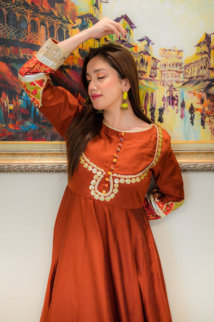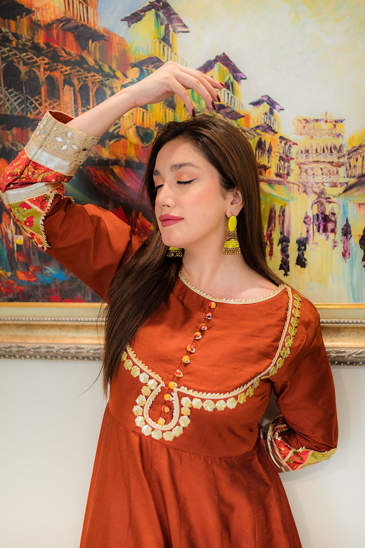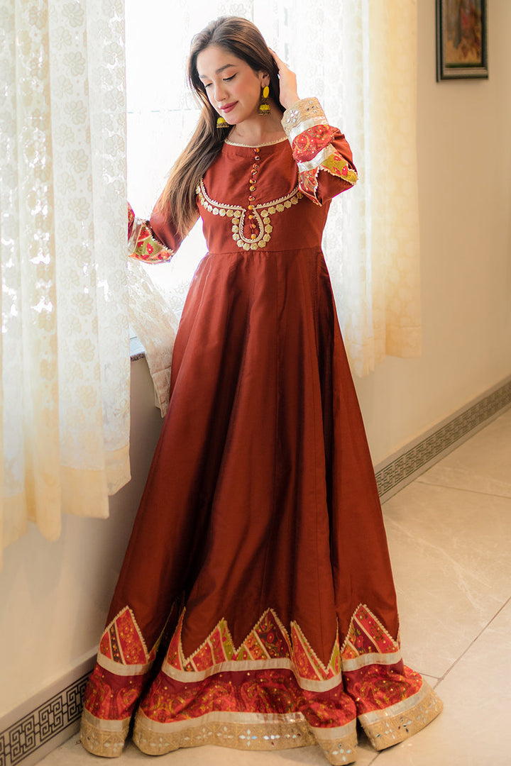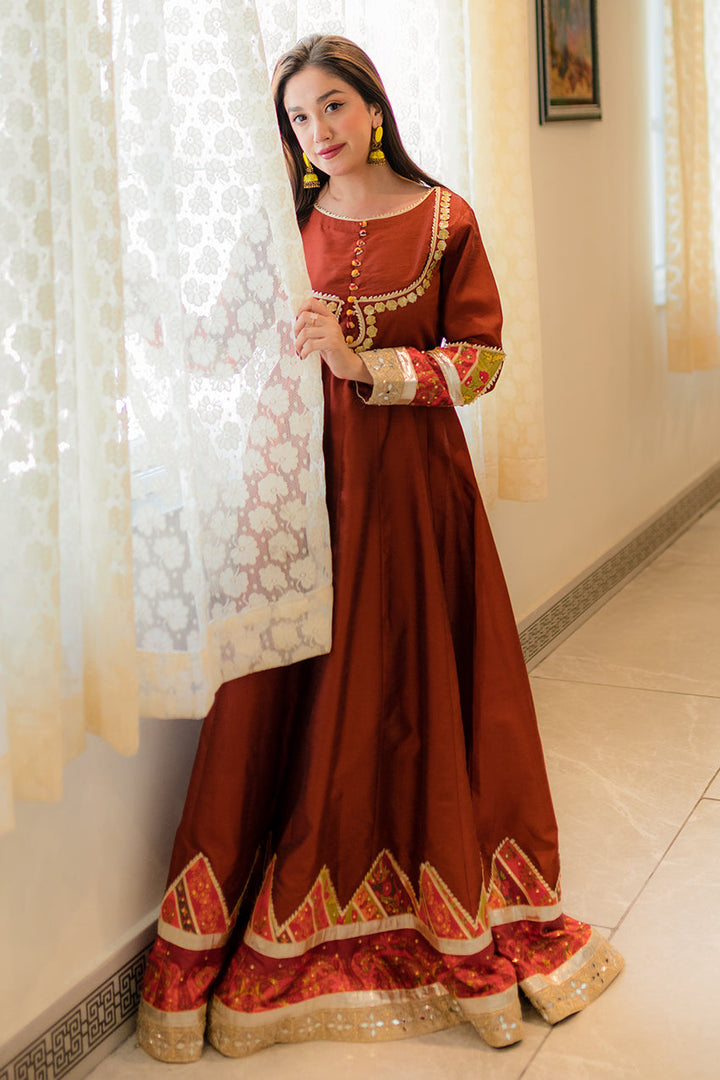 Embody timeless sophistication in this stunning rust-hued raw silk gown, expertly designed with an intricate multi-print triangle pattern.Luxurious rust raw silk fabric drapes elegantly, falling to the ankles.Delicate triangle patterns in contrasting hues adorn the borders and sleeves.