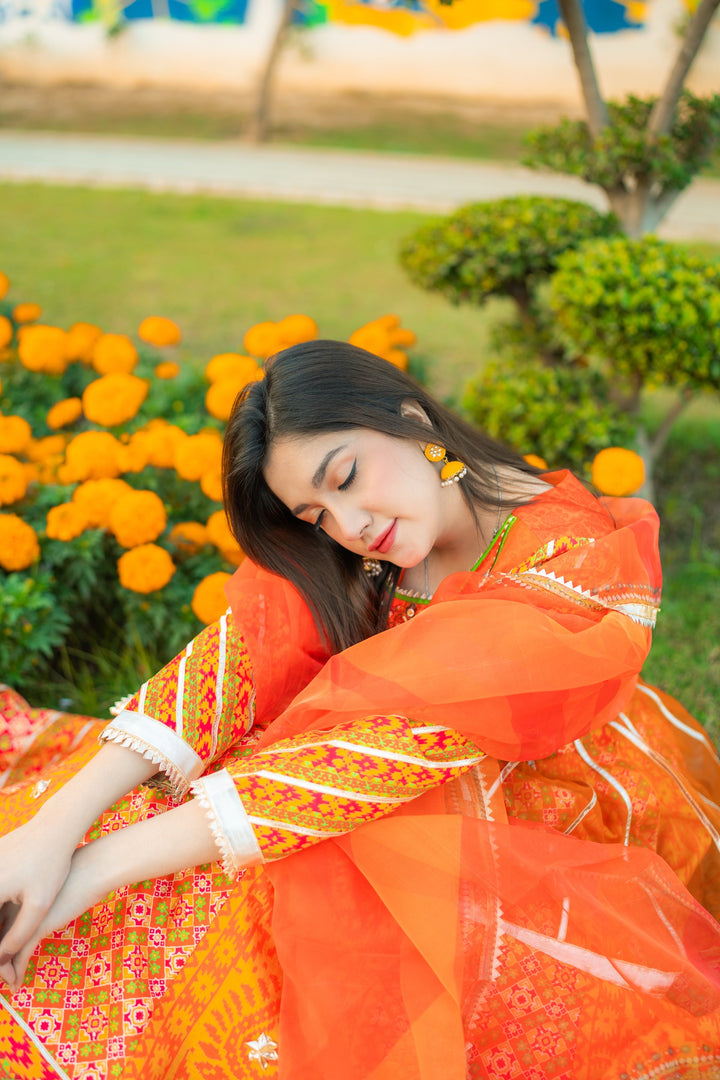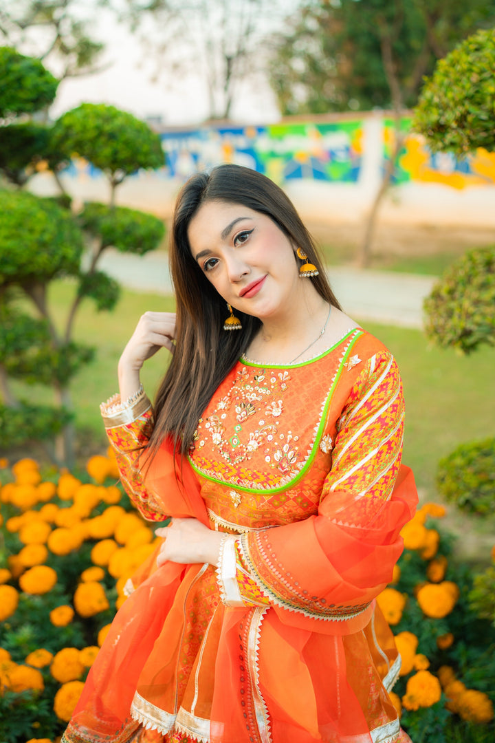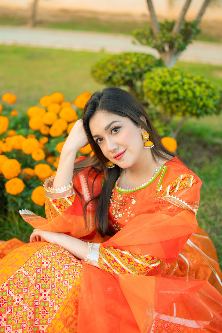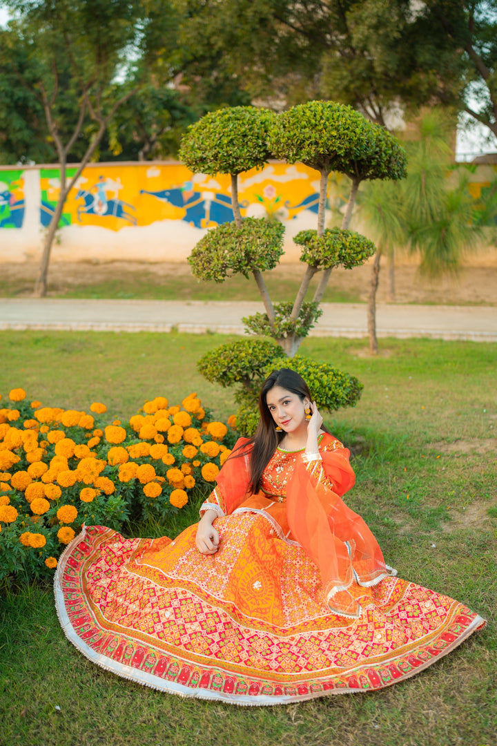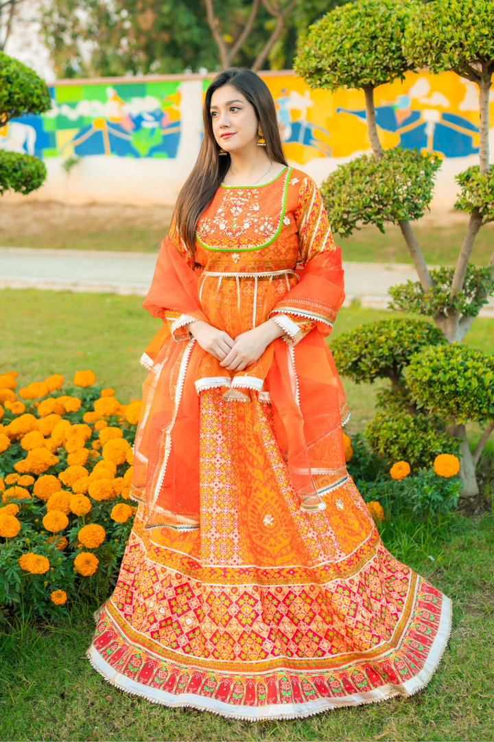 Orange silk lehenga with peplum, intricately digital printed and lavishly embellished with gotta, beads, and stones. The luxurious silk fabric provides a stunning canvas for the vibrant, intricate designs, while the rich orange with multicolor hue evokes the mystery and allure of antique glass.