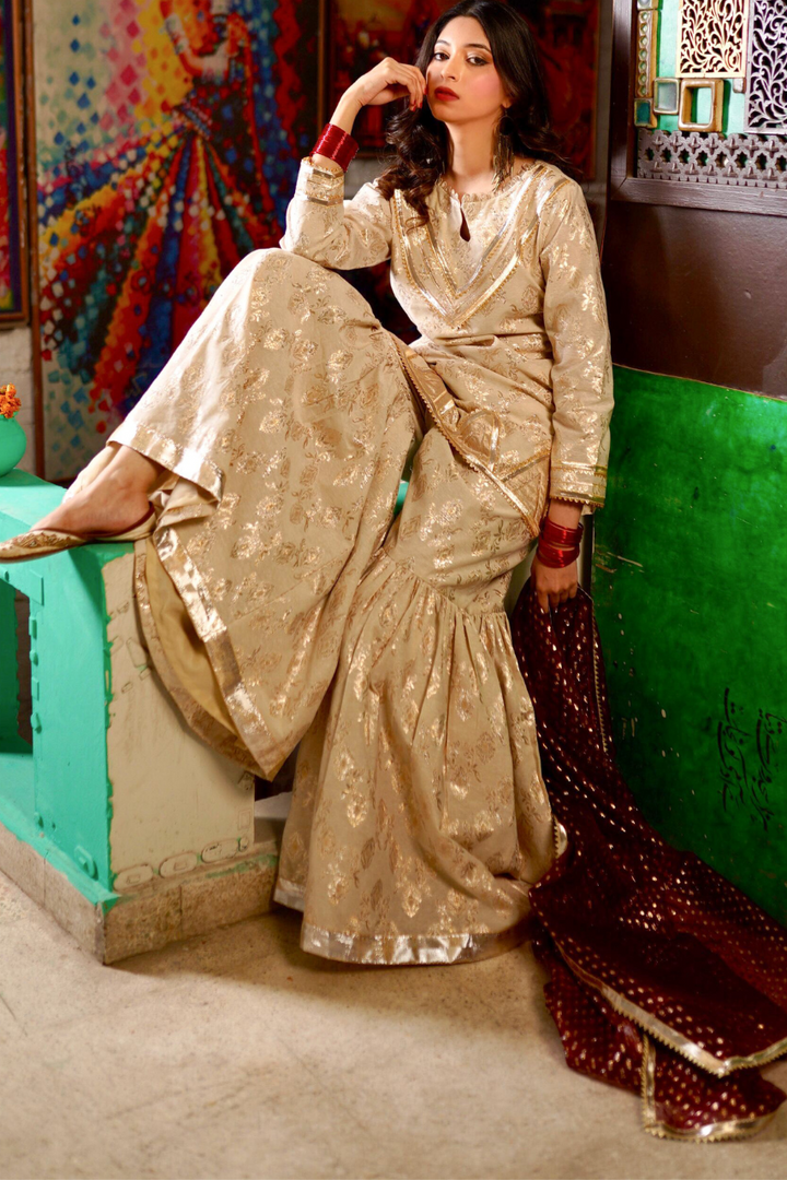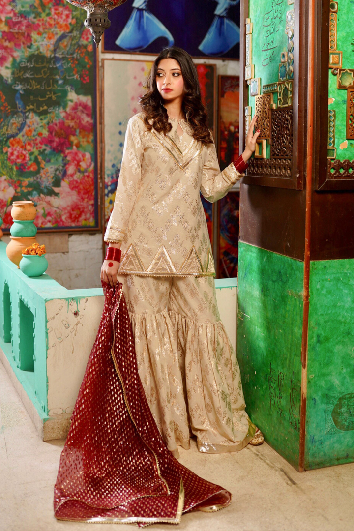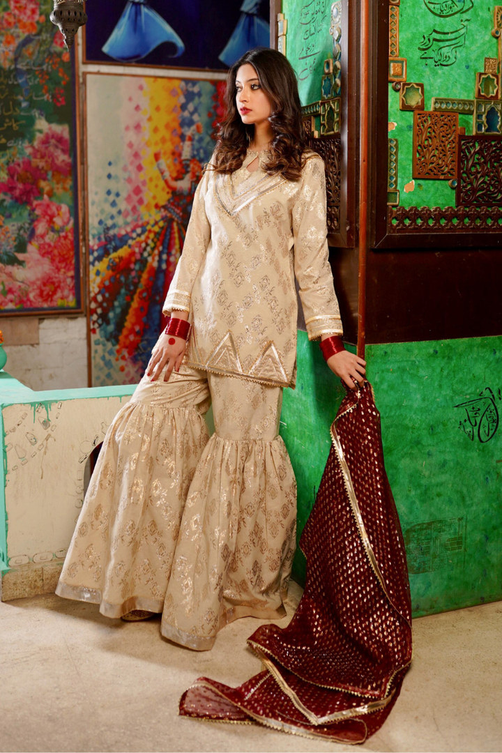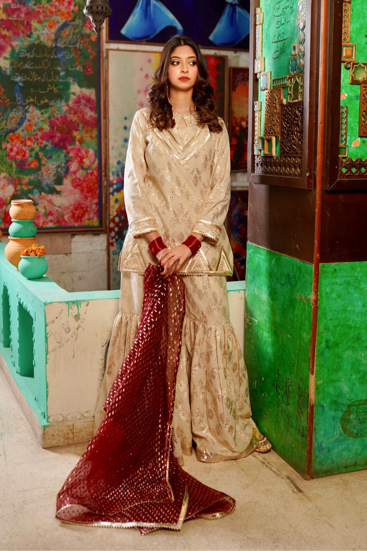 A white karandi shirt paired with a gharara features intricate embellishments, including gotta, lappa, and triangle designs. The gotta adds subtle texture, while lappa and triangle patterns create visual interest. The overall look is elegant and traditional. Maroon organza duppata with four side lappa and lace.