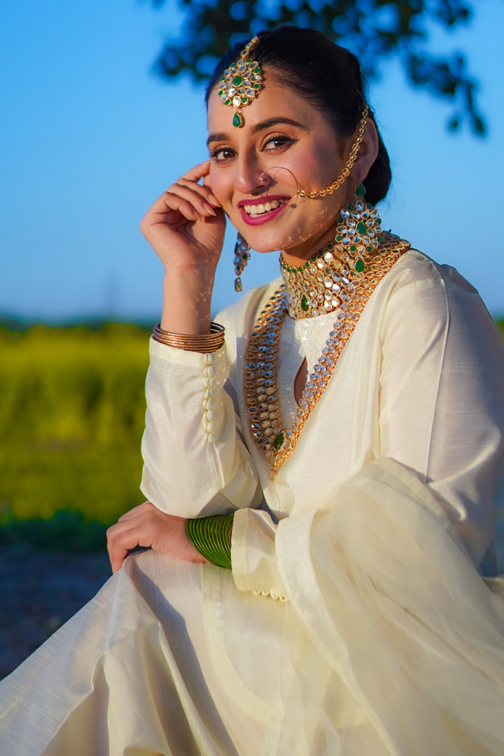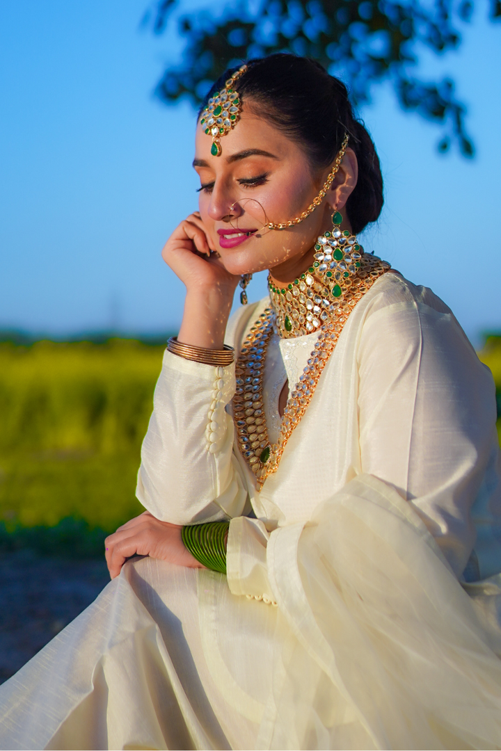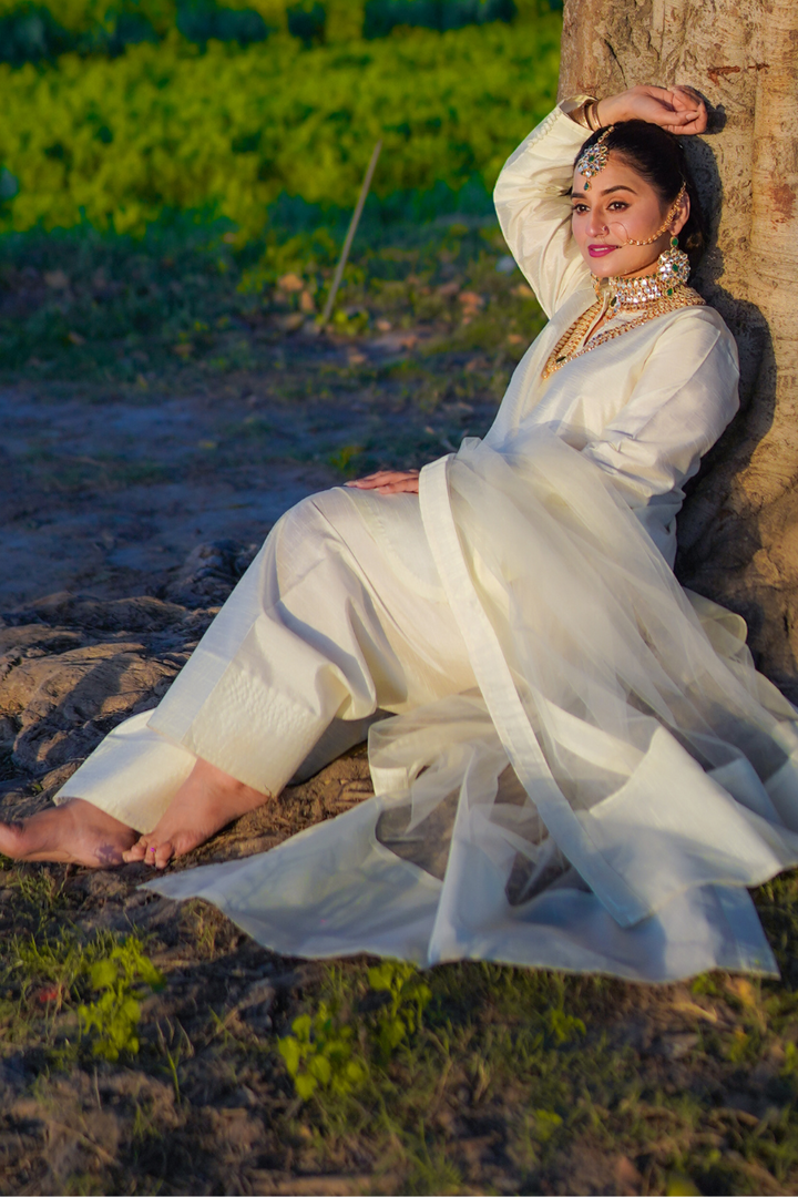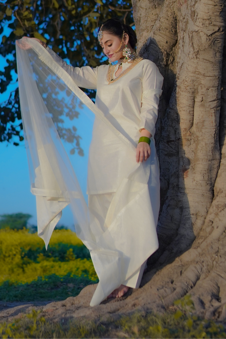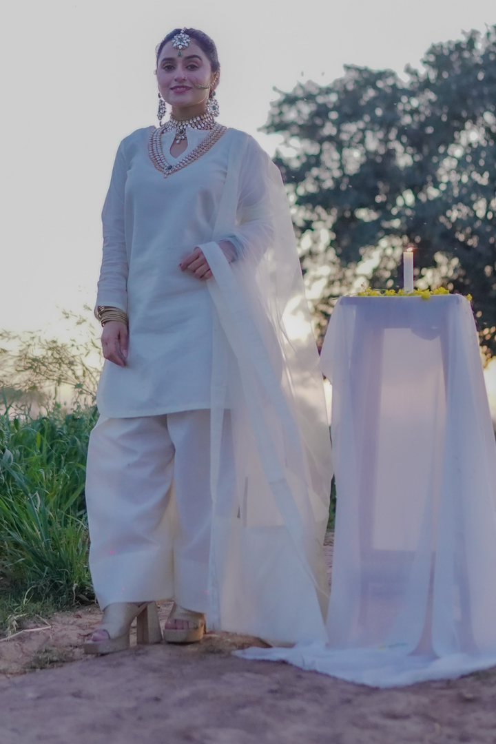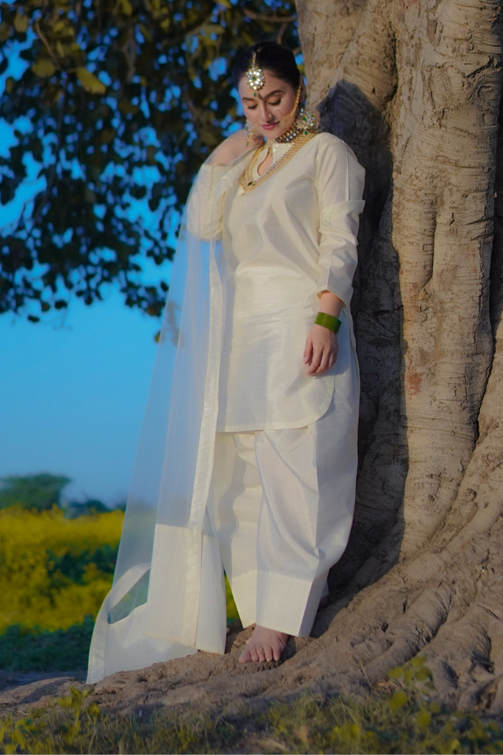 Beige raw silk shirt with round edges ghera stylize with farshi shalwar. Paired with organza dupatta with raw silk pallu.