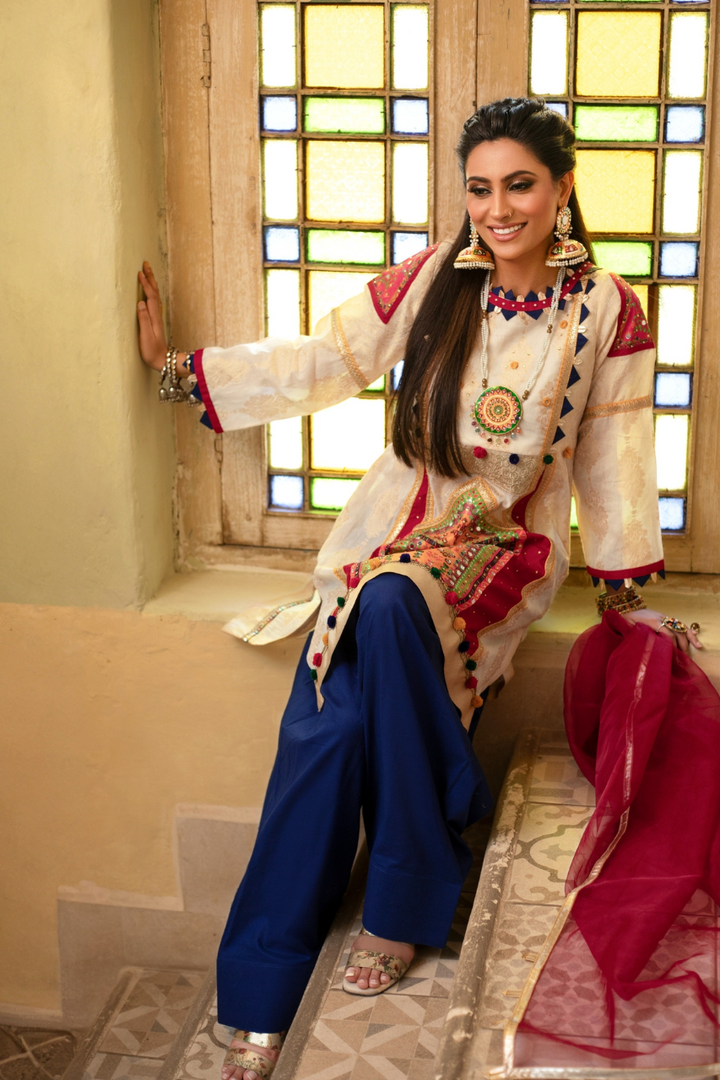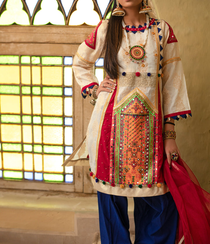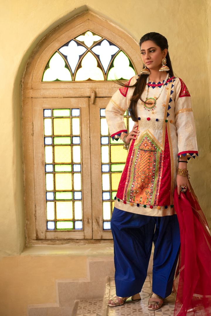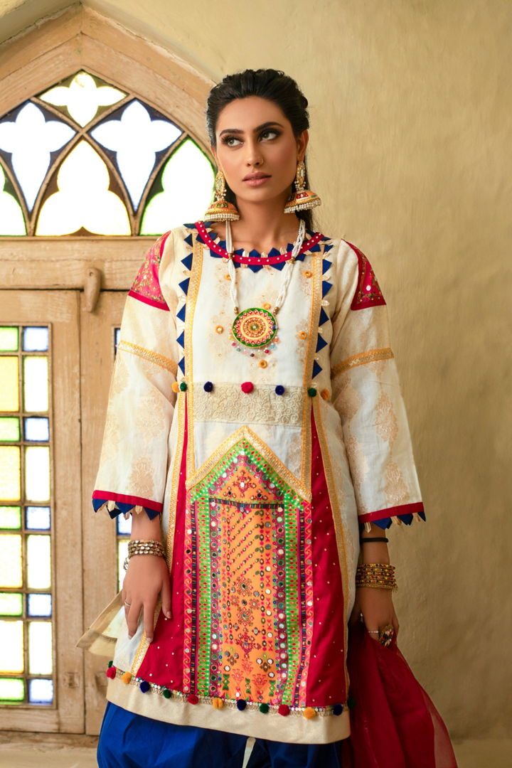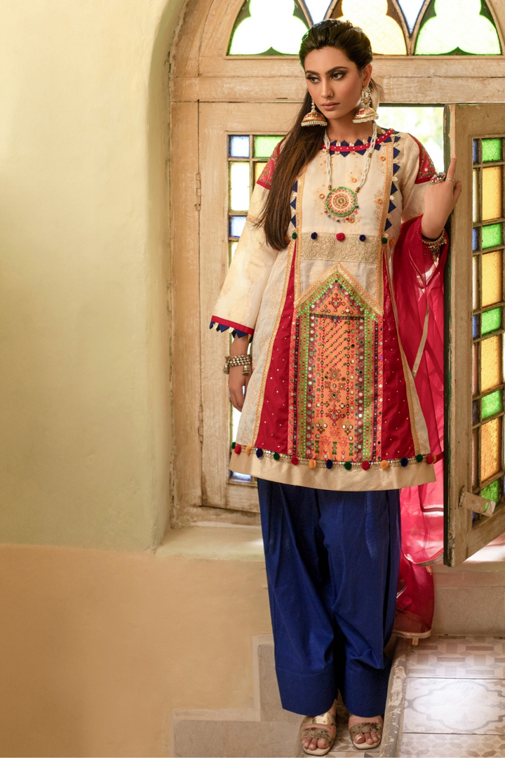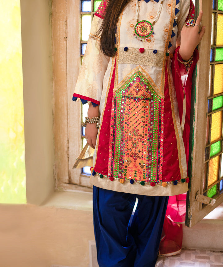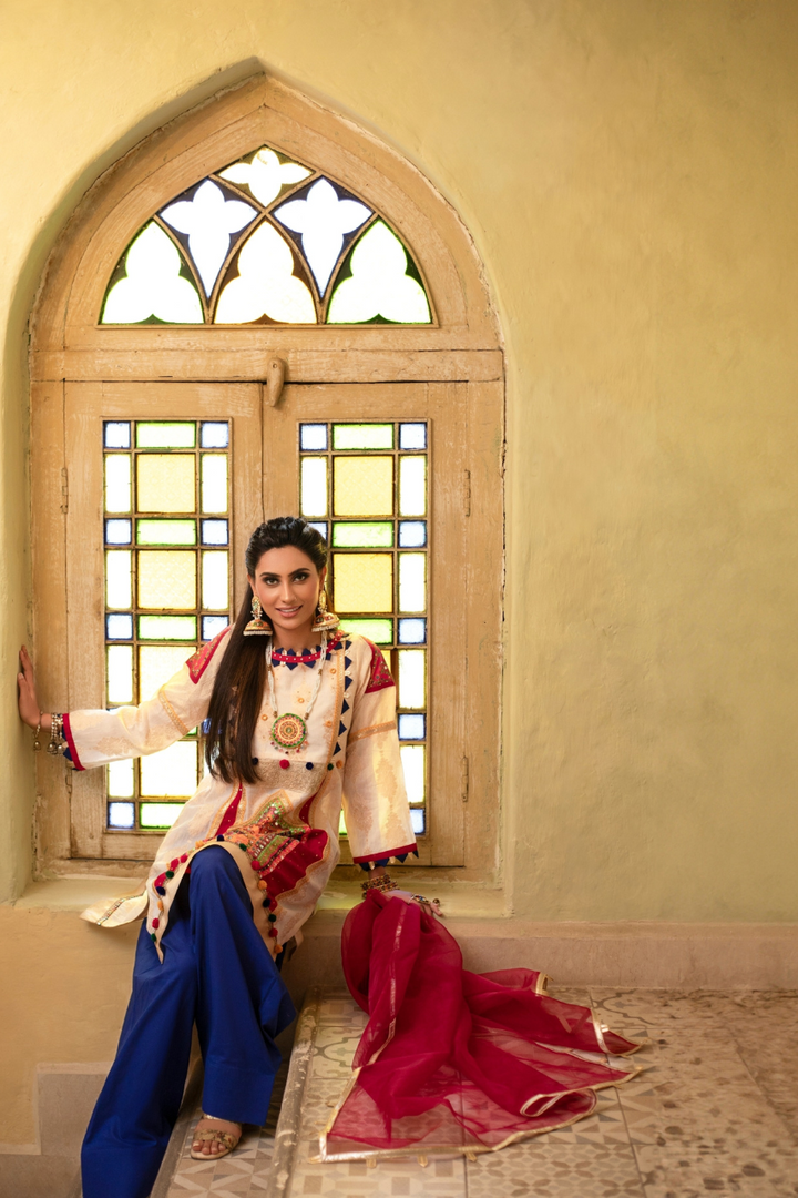 White jacquard shirt beautifully adorned with multicolored details,motifs,laces and pom pom.Paired with farshi shalwar in blue color and red organza dupatta with edging.