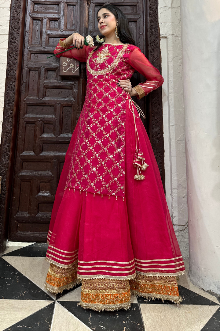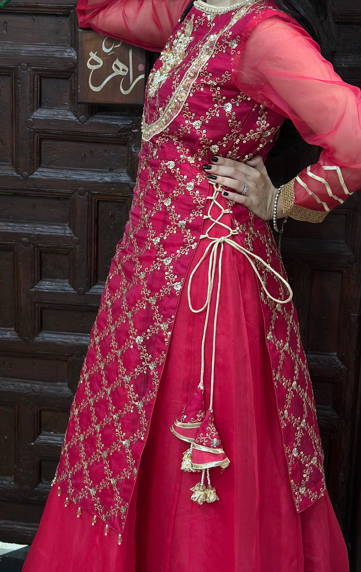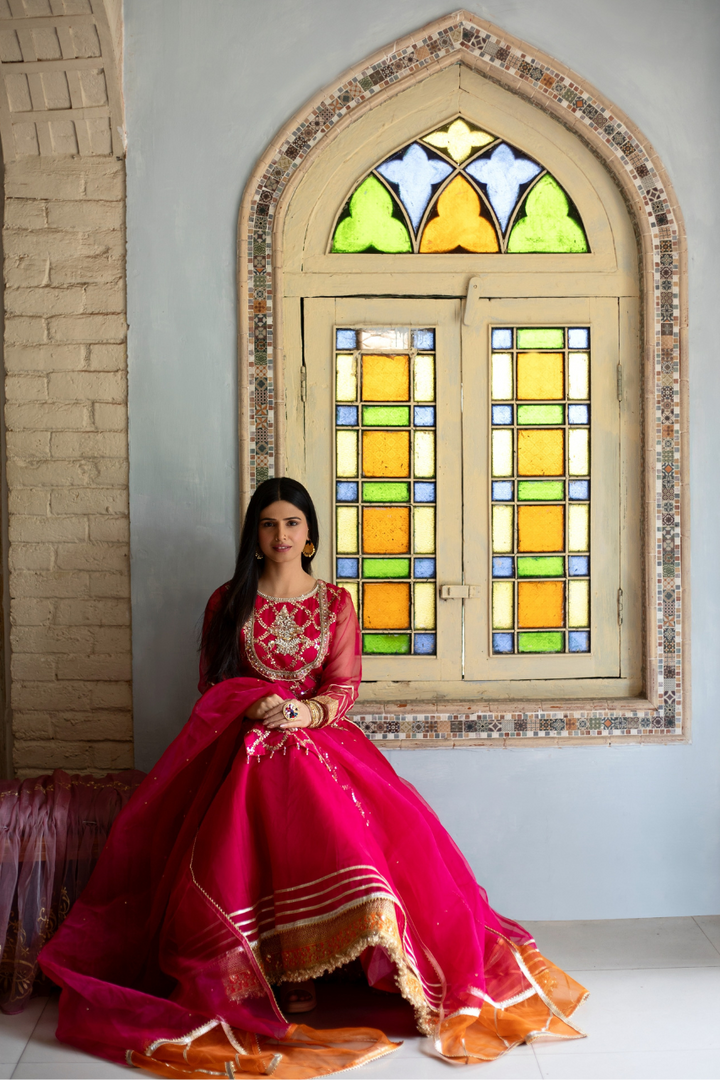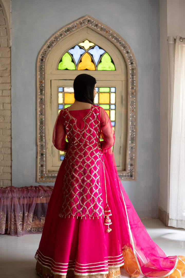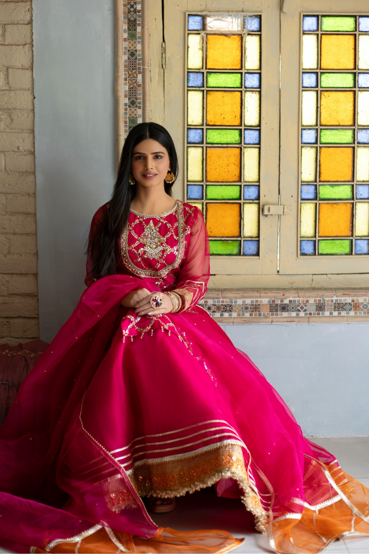Shocking pink embroidered organza gown with organza lower layer. Beautiful embellished neckline. Laces on borders, tassels on sides. Paired with organza dupatta in double color orange and pink.